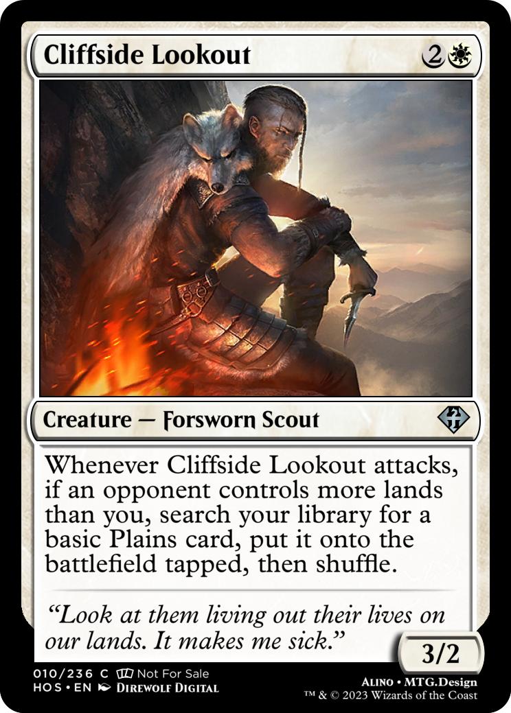 Whenever Cliffside Lookout attacks, if an opponent controls more lands than you, search your library for a basic Plains card, put it onto the battlefield tapped, then shuffle.