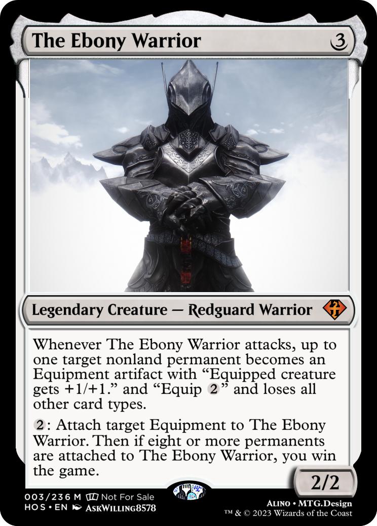 {2}: Attach target Equipment to The Ebony Warrior. Then if eight or more permanents are attached to The Ebony Warrior, you win the game.