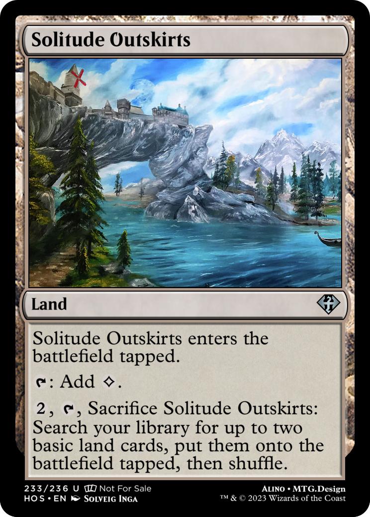 {2}, {T}, Sacrifice Solitude Outskirts: Search your library for up to two basic land cards, put them onto the battlefield tapped, then shuffle.