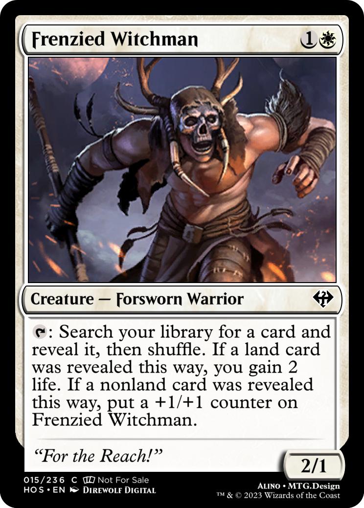 {T}: Search your library for a card and reveal it, then shuffle. If a land card was revealed this way, you gain 2 life. If a nonland card was revealed this way, put a +1/+1 counter on Frenzied Witchman.