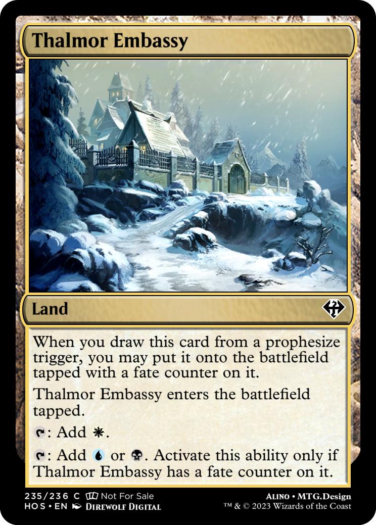 {T}: Add {U} or {B}. Activate this ability only if Thalmor Embassy has a fate counter on it.