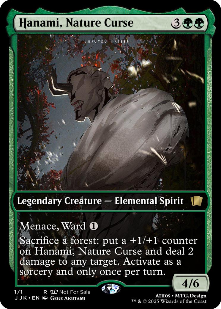 Sacrifice a forest: put a +1/+1 counter on Hanami, Nature Curse and deal 2 damage to any target. Activate as a sorcery and only once per turn.