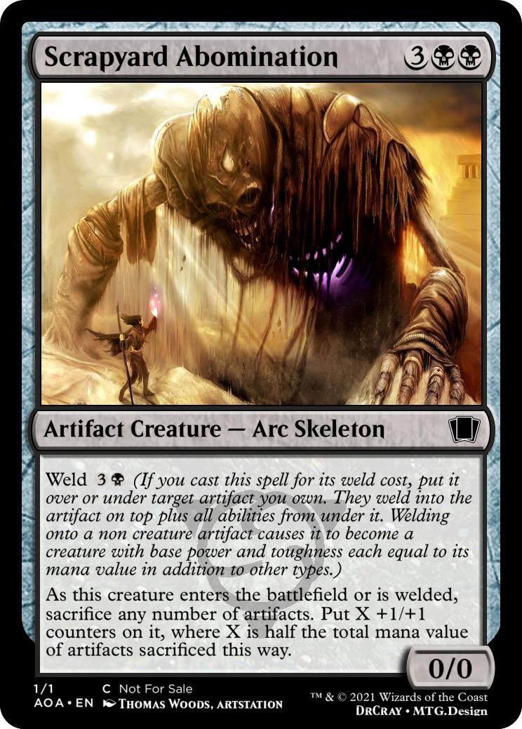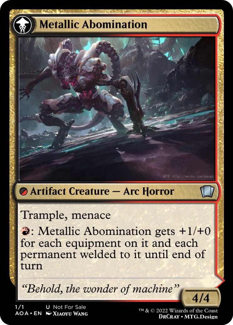 {R}: Metallic Abomination gets +1/+0 for each equipment on it and each permanent welded to it until end of turn