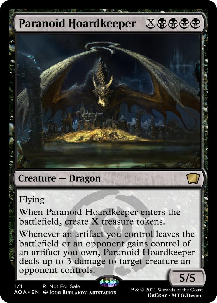 Whenever an artifact you control leaves the battlefield or an opponent gains control of an artifact you own, Paranoid Hoardkeeper deals up to 3 damage to target creature an opponent controls.