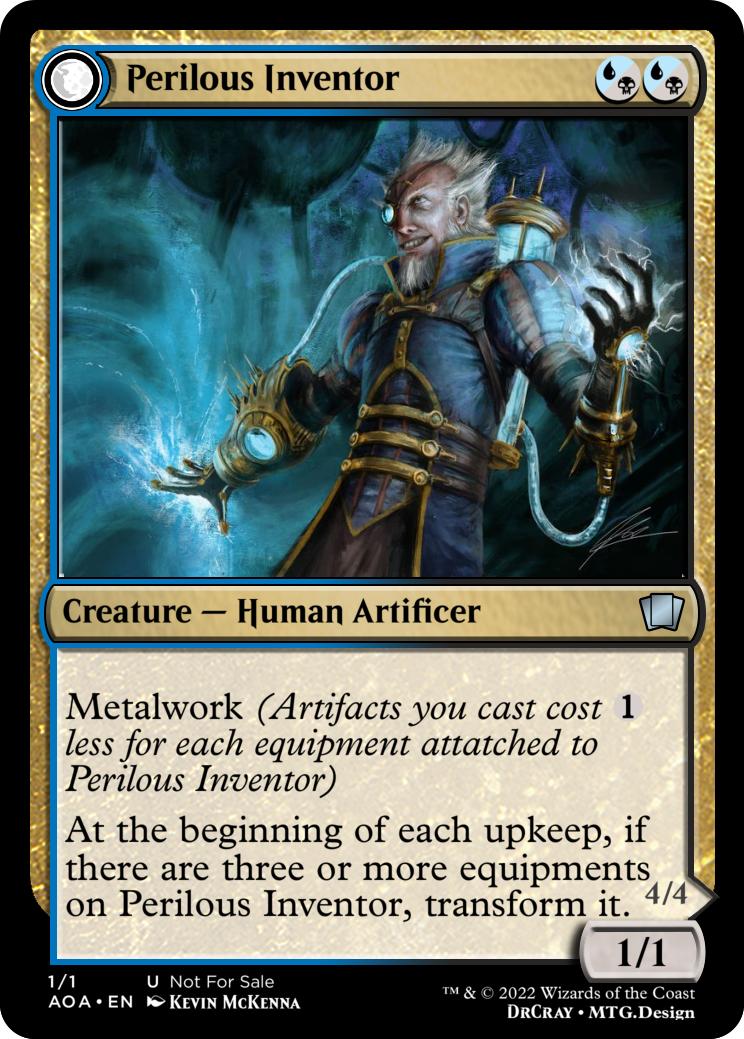 At the beginning of each upkeep, if there are three or more equipments on Perilous Inventor, transform it.