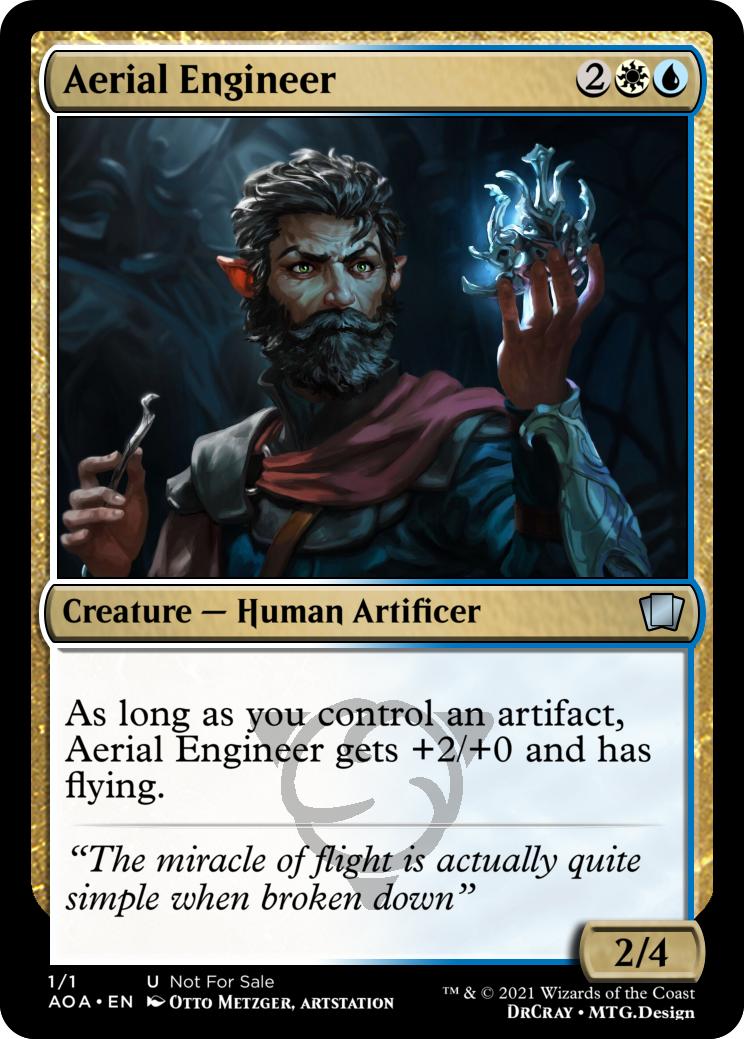 As long as you control an artifact, Aerial Engineer gets +2/+0 and has flying.