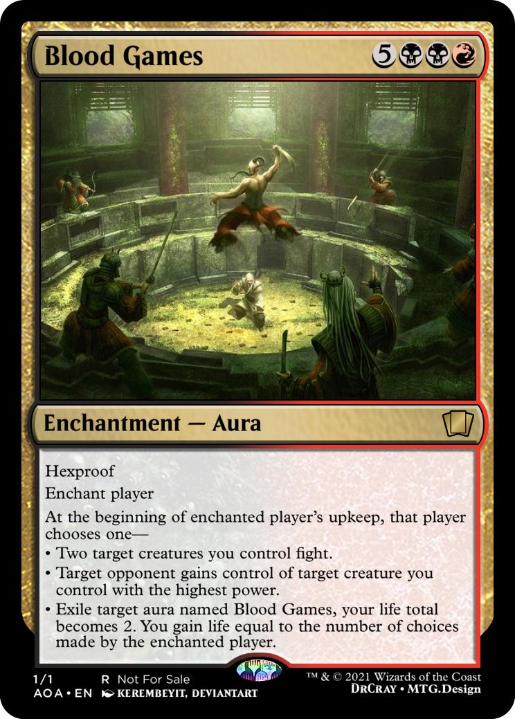 • Exile target aura named Blood Games, your life total becomes 2. You gain life equal to the number of choices made by the enchanted player.