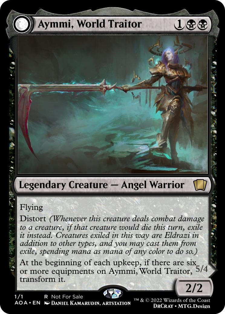 At the beginning of each upkeep, if there are six or more equipments on Aymmi, World Traitor, transform it.