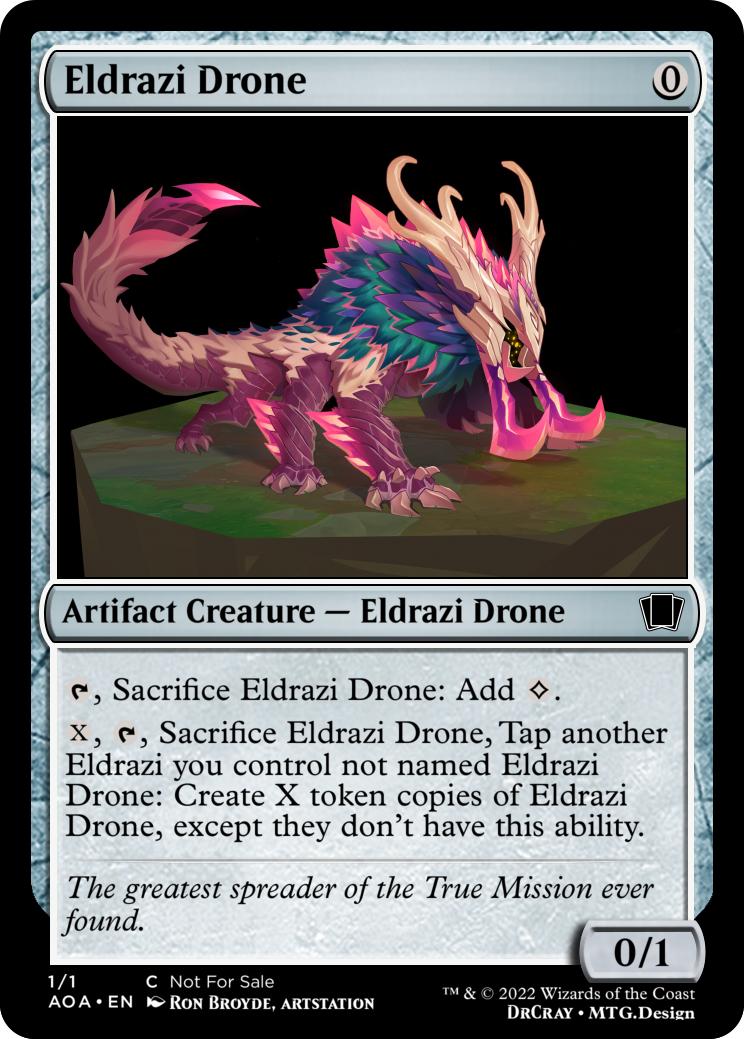 {X}, {T}, Sacrifice Eldrazi Drone, Tap another Eldrazi you control not named Eldrazi Drone: Create X token copies of Eldrazi Drone, except they don’t have this ability.
