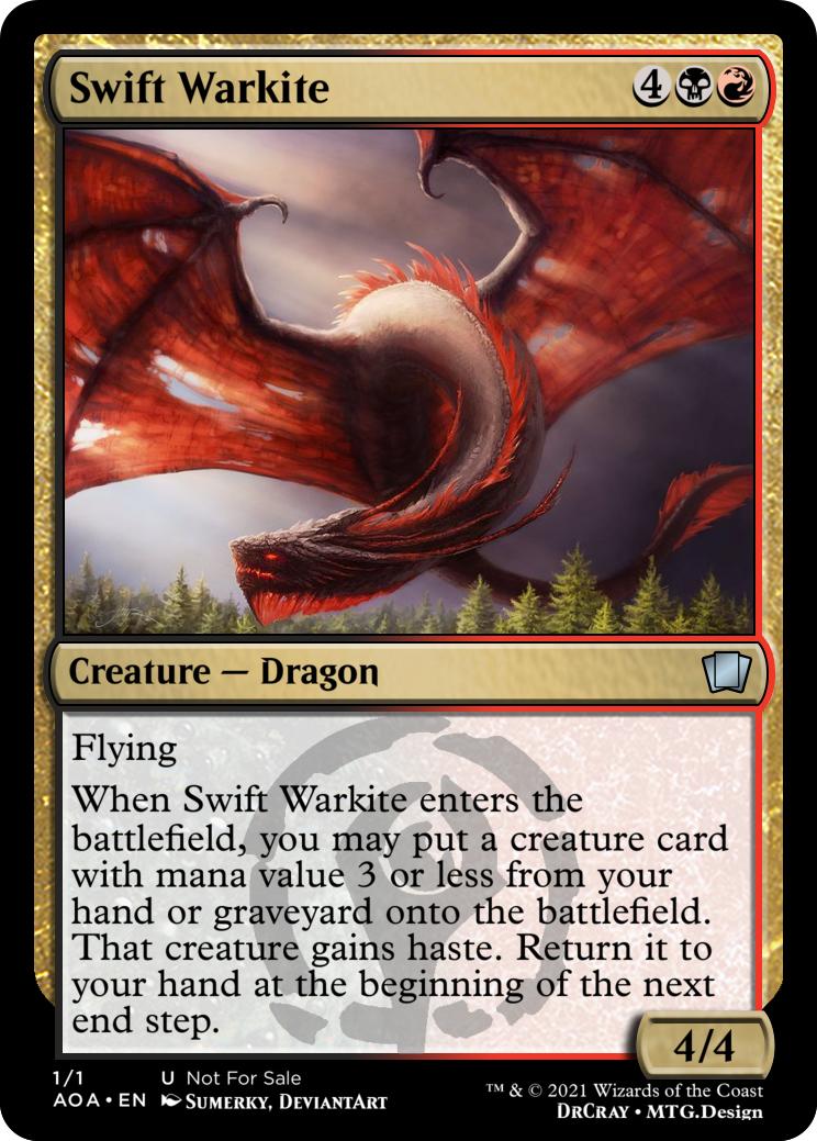 When Swift Warkite enters the battlefield, you may put a creature card with mana value 3 or less from your hand or graveyard onto the battlefield. That creature gains haste. Return it to your hand at the beginning of the next end step.