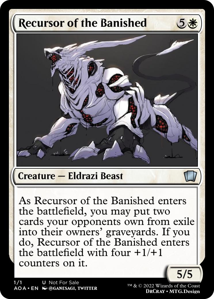 As Recursor of the Banished enters the battlefield, you may put two cards your opponents own from exile into their owners’ graveyards. If you do, Recursor of the Banished enters the battlefield with four +1/+1 counters on it.