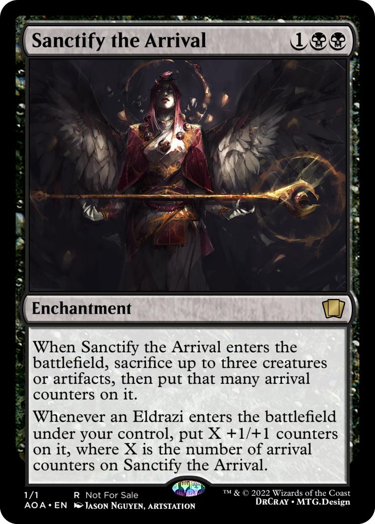Whenever an Eldrazi enters the battlefield under your control, put X +1/+1 counters on it, where X is the number of arrival counters on Sanctify the Arrival.