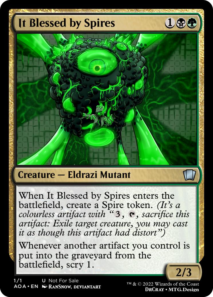 When It Blessed by Spires enters the battlefield, create a Spire token. (It’s a colourless artifact with “{3}, {t}, sacrifice this artifact: Exile target creature, you may cast it as though this artifact had distort”)
