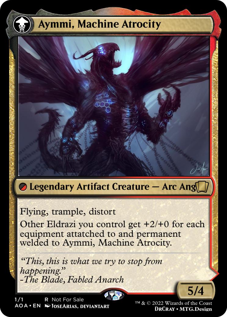 Other Eldrazi you control get +2/+0 for each equipment attatched to and permanent welded to Aymmi, Machine Atrocity.