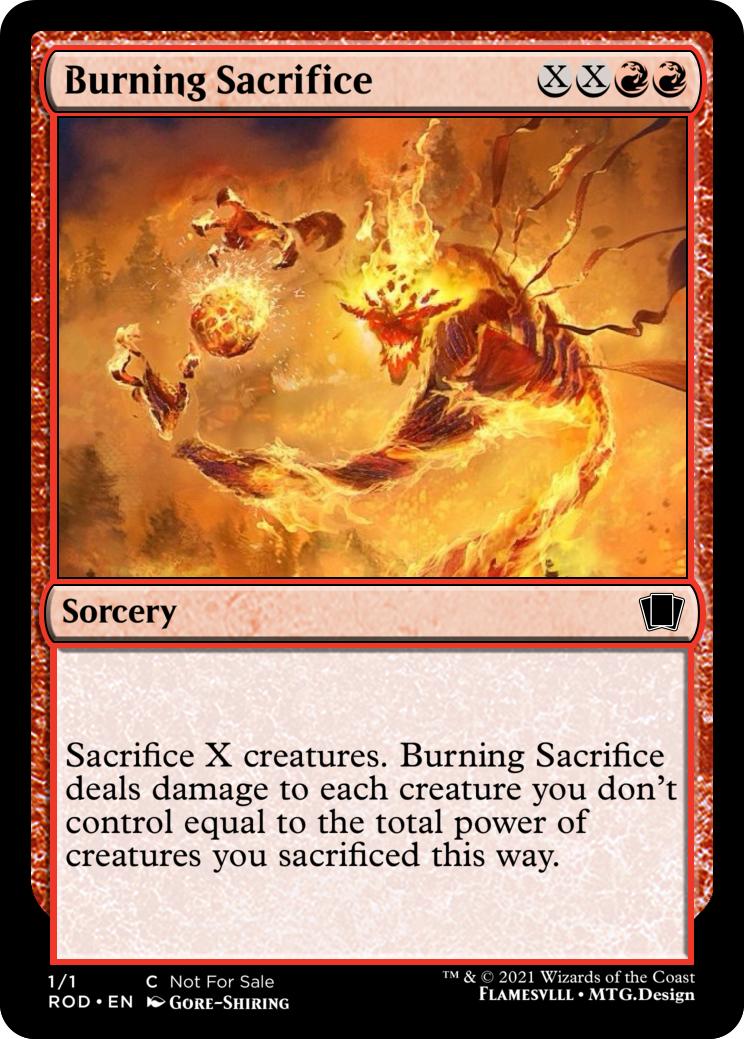 Sacrifice X creatures. Burning Sacrifice deals damage to each creature you don't control equal to the total power of creatures you sacrificed this way.