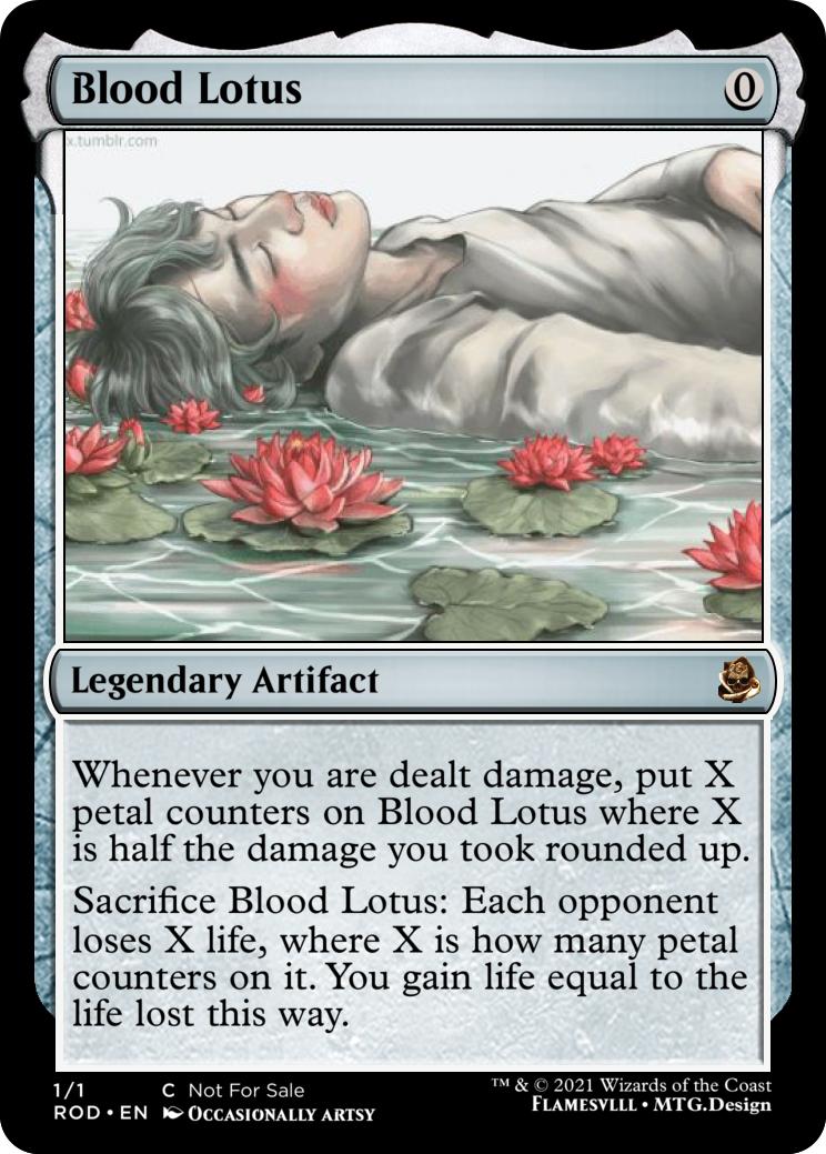 Whenever you are dealt damage, put X petal counters on Blood Lotus where X is half the damage you took rounded up.