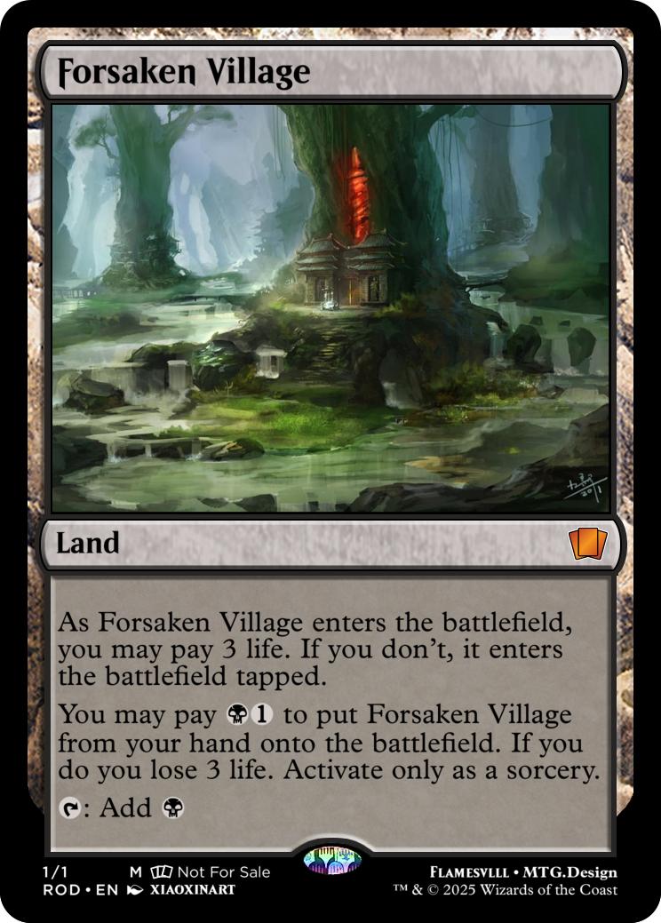 You may pay {B}{1} to put Forsaken Village from your hand onto the battlefield. If you do you lose 3 life. Activate only as a sorcery.