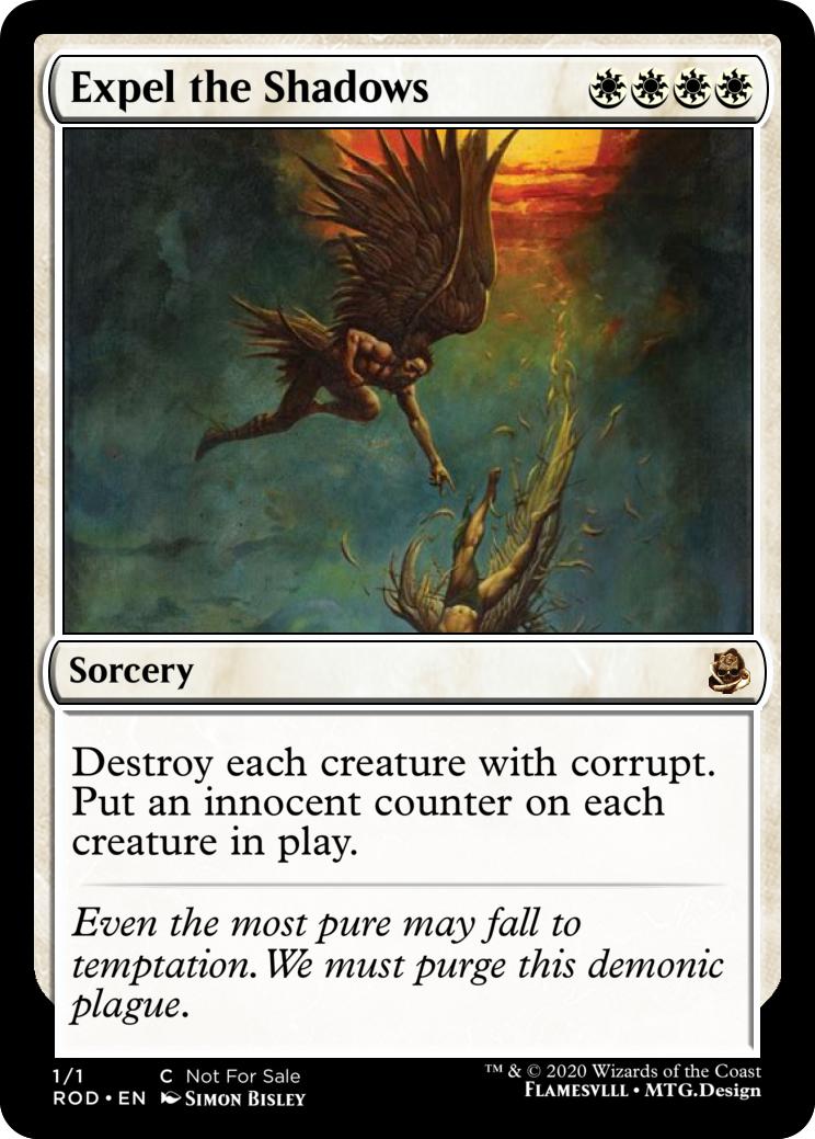 Destroy each creature with corrupt. Put an innocent counter on each creature in play.