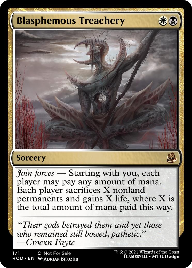 Join forces — Starting with you, each player may pay any amount of mana. Each player sacrifices X nonland permanents and gains X life, where X is the total amount of mana paid this way.