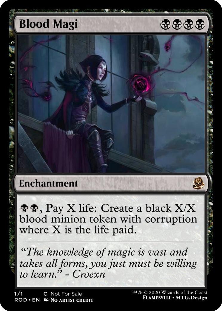 {b}{b}, Pay X life: Create a black X/X blood minion token with corruption where X is the life paid.