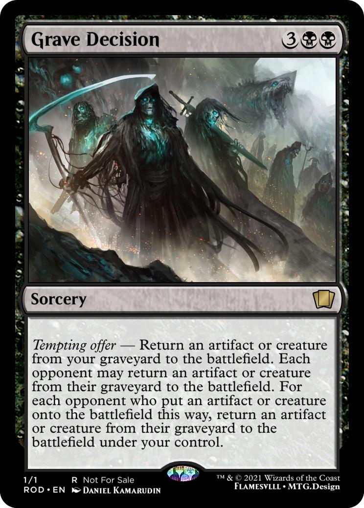 Council's dilemma — Starting with you, each player votes for death or life. Each player sacrifices a creature for each death vote and may cast a creature from their gaveyard without paying its mana cost for each life vote. Each player loses life equal to the mana value of creatures they cast this way.