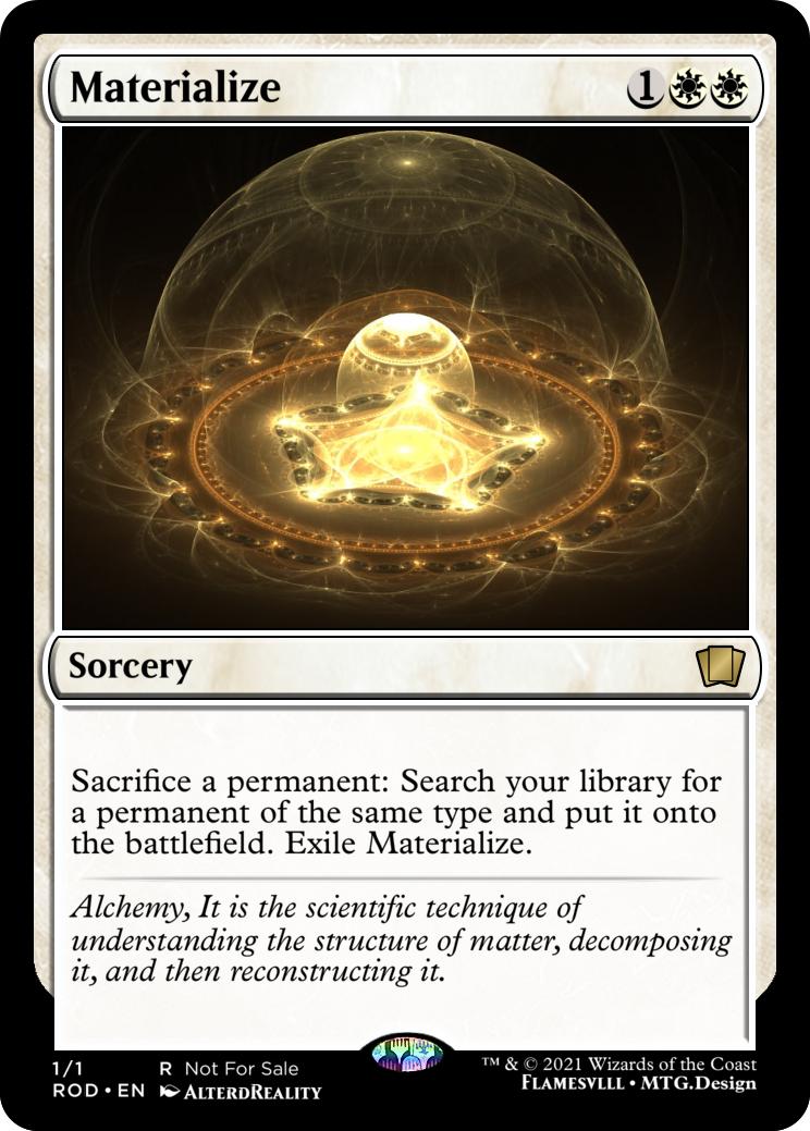 Sacrifice a permanent: Search your library for a permanent of the same type and put it onto the battlefield. Exile Materialize.