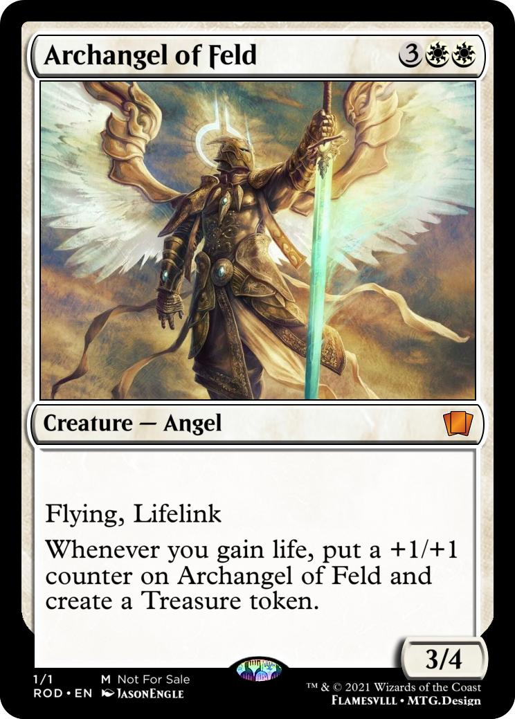Whenever you gain life, put a +1/+1 counter on Archangel of Feld and create a Treasure token.