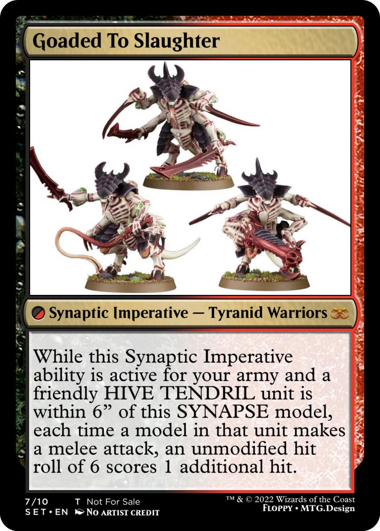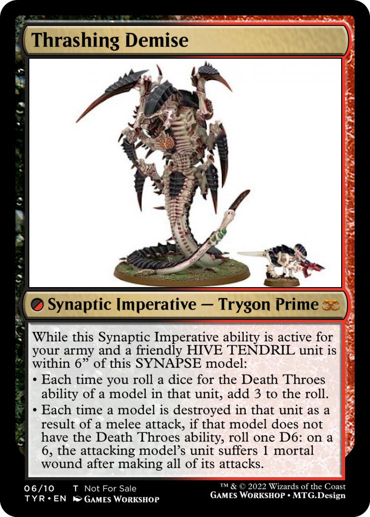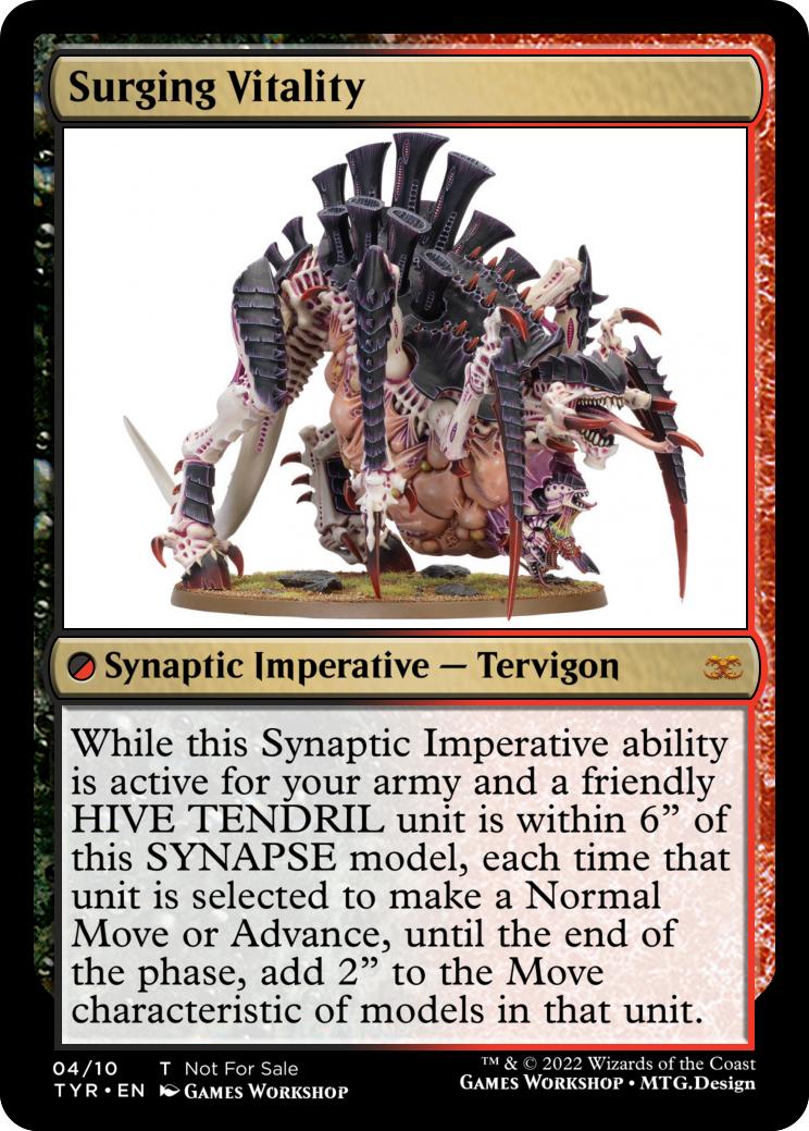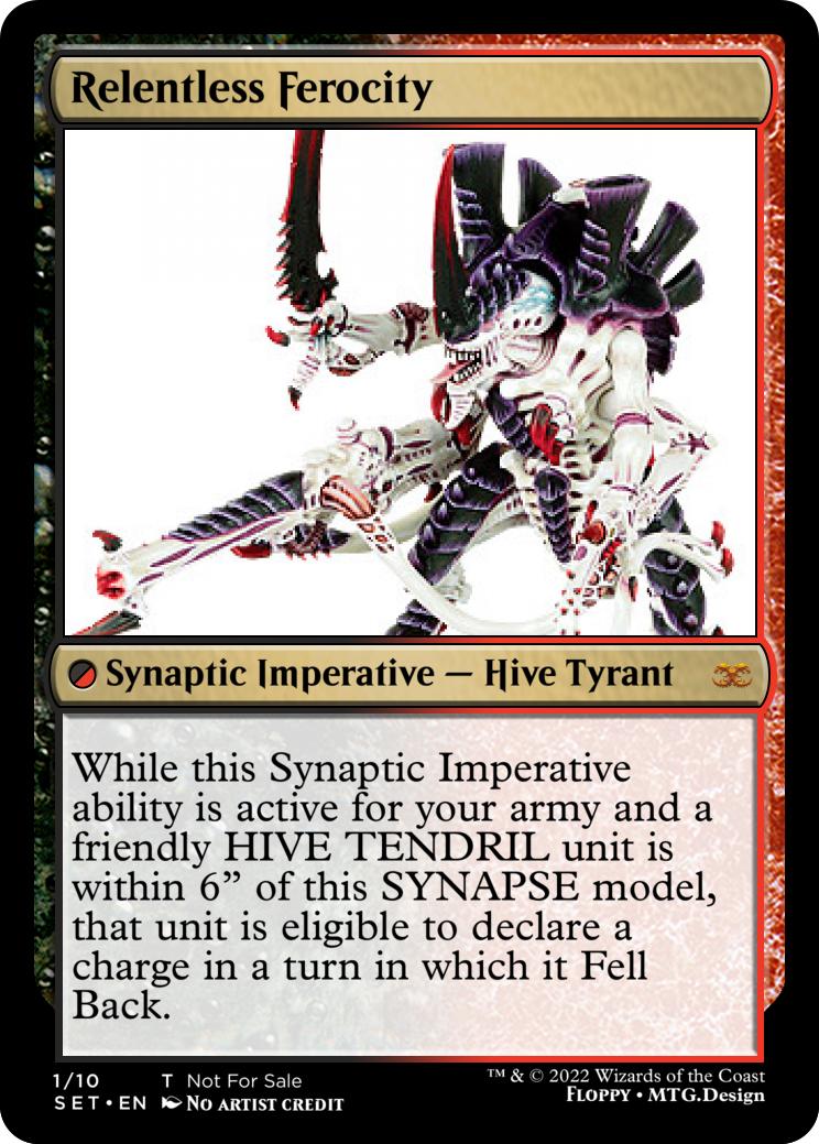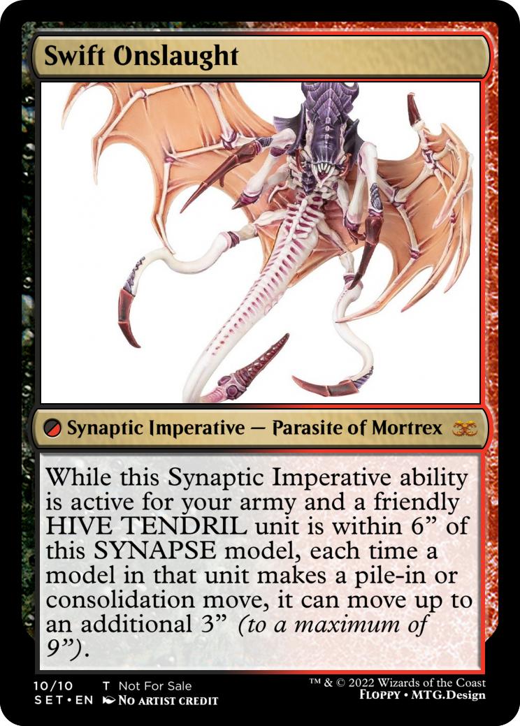 While this Synaptic Imperative ability is active for your army and a friendly HIVE TENDRIL unit is within 6" of this SYNAPSE model, that unit is eligible to declare a charge in a turn in which it Fell Back.