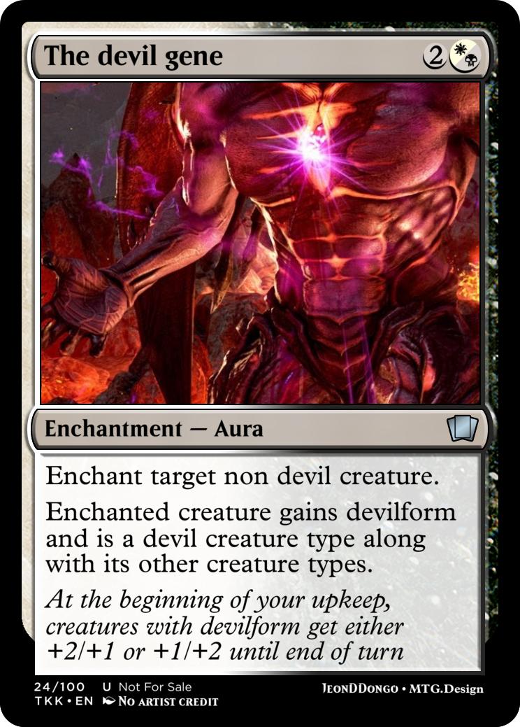Enchanted creature gains devilform and is a devil creature type along with its other creature types.