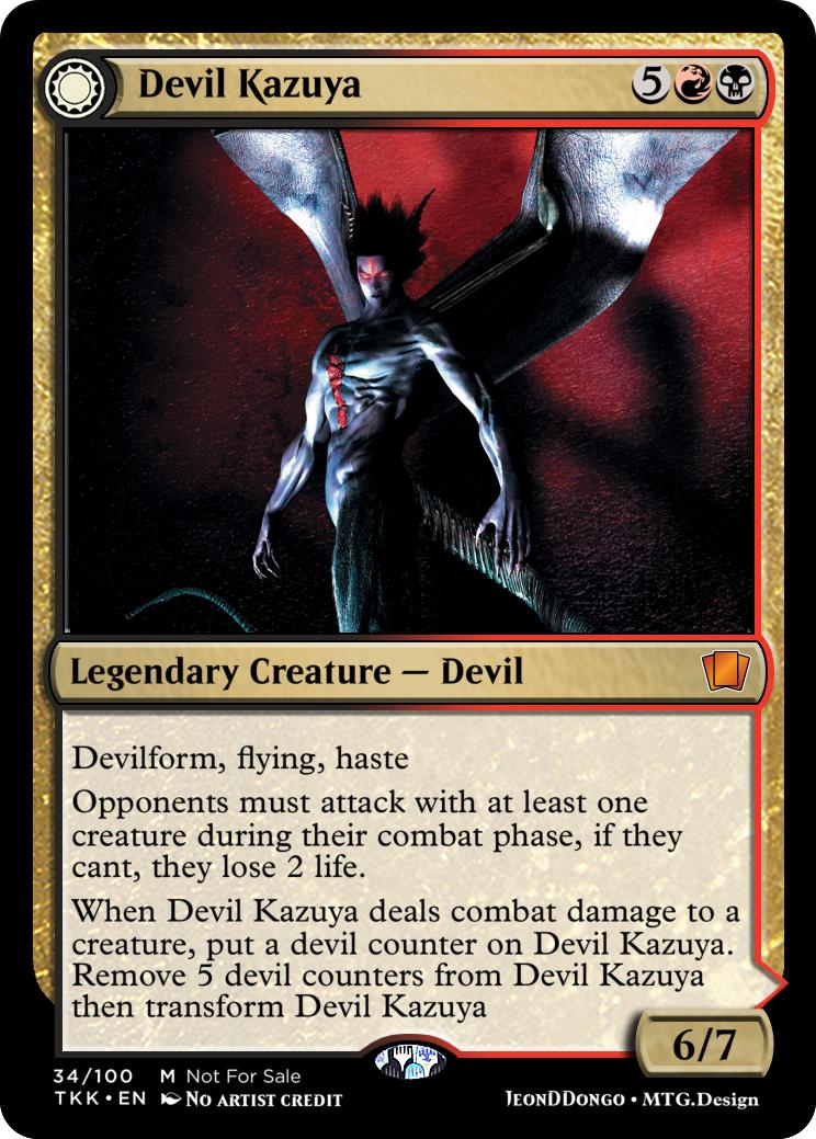 When Devil Kazuya deals combat damage to a creature, put a devil counter on Devil Kazuya. Remove 5 devil counters from Devil Kazuya then transform Devil Kazuya