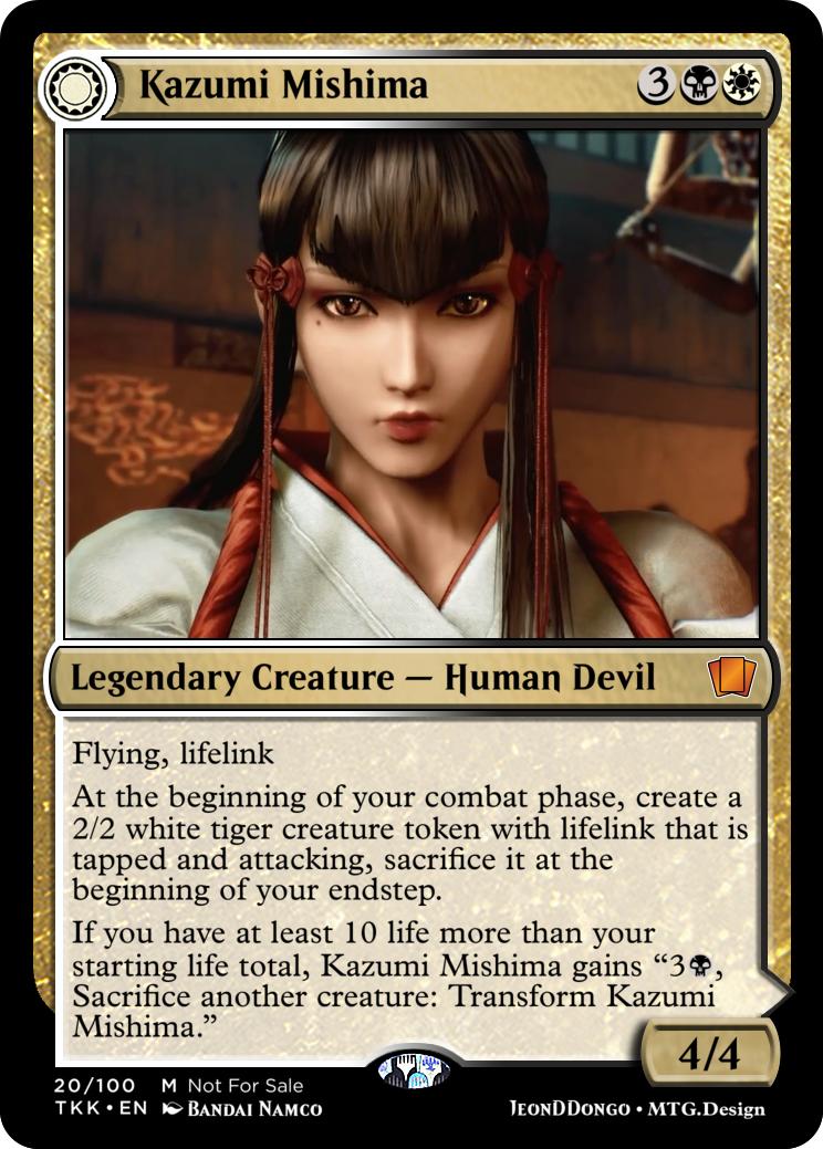 If you have at least 10 life more than your starting life total, Kazumi Mishima gains "3{b}, Sacrifice another creature: Transform Kazumi Mishima."