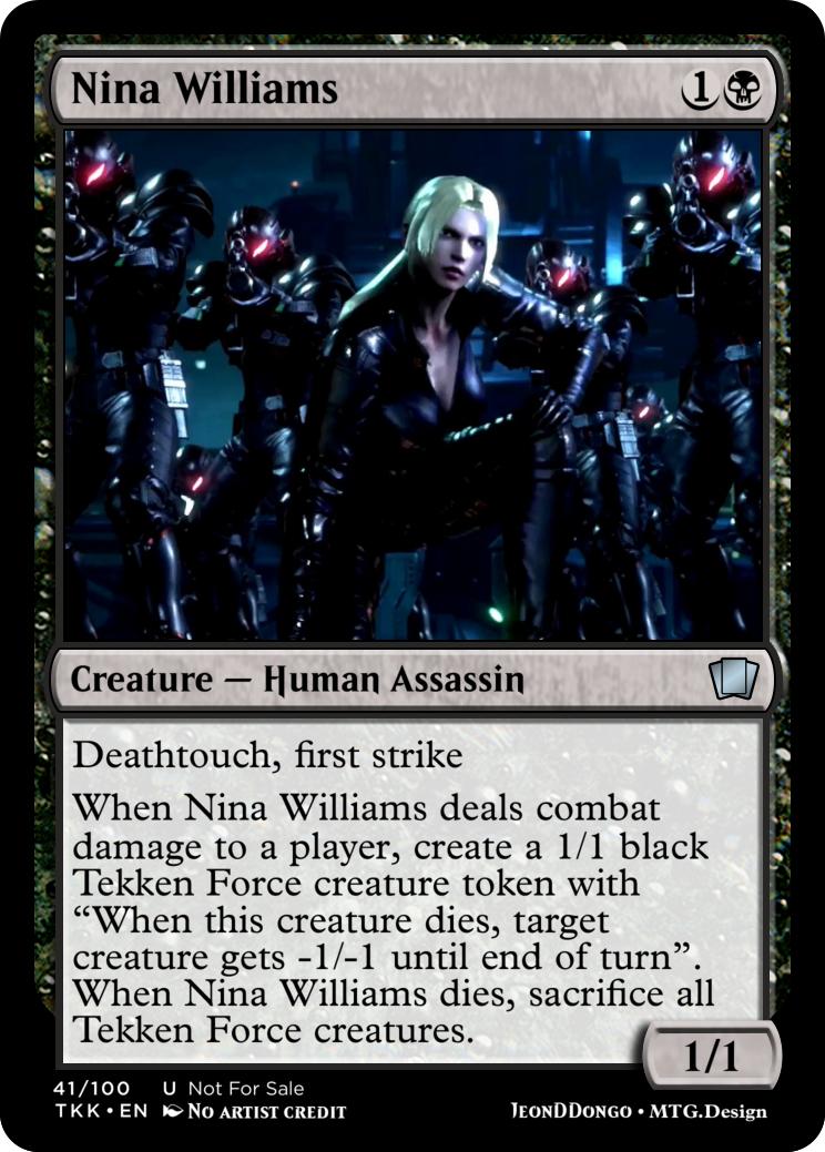 When Nina Williams deals combat damage to a player, create a 1/1 black Tekken Force creature token with "When this creature dies, target creature gets -1/-1 until end of turn". When Nina Williams dies, sacrifice all Tekken Force creatures.