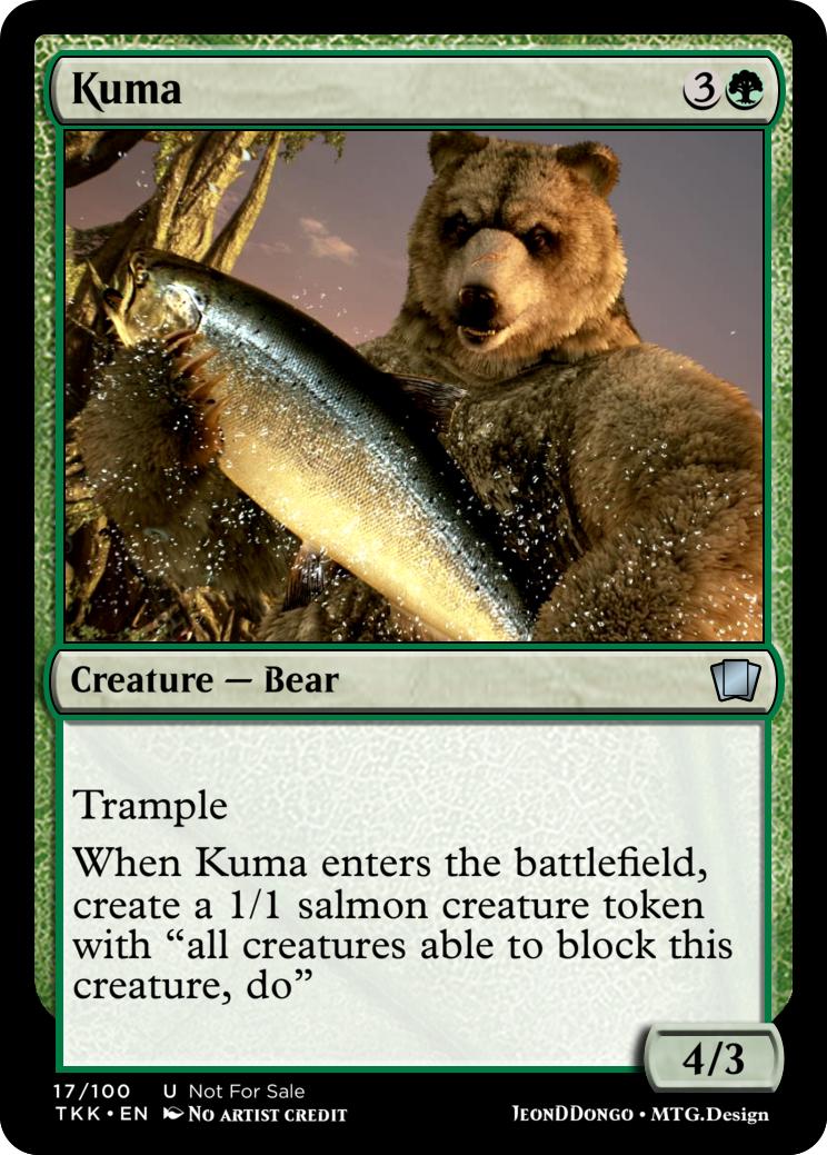 When Kuma enters the battlefield, create a 1/1 salmon creature token with "all creatures able to block this creature, do"