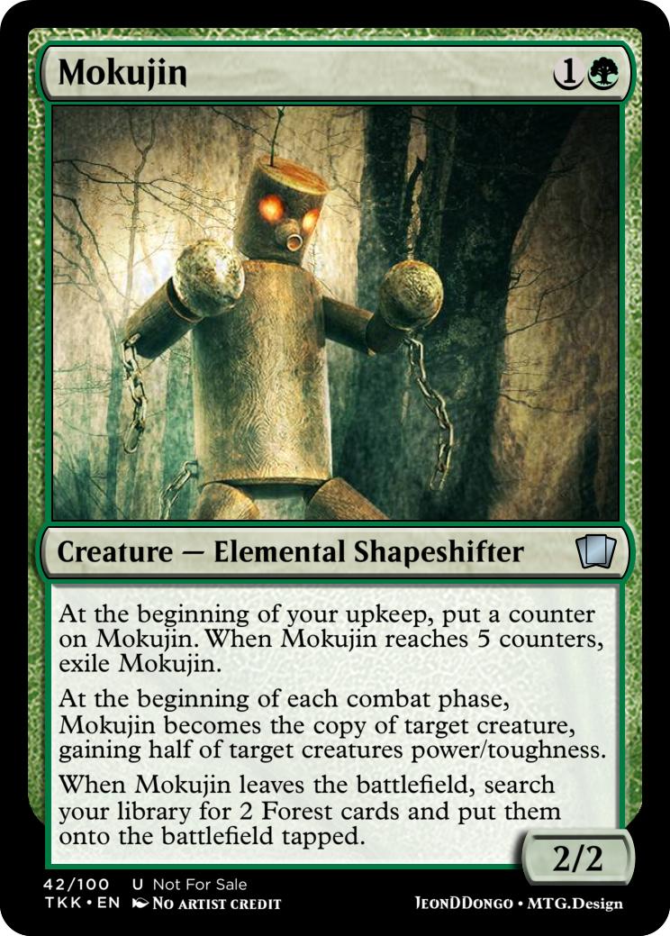 When Mokujin leaves the battlefield, search your library for 2 Forest cards and put them onto the battlefield tapped.