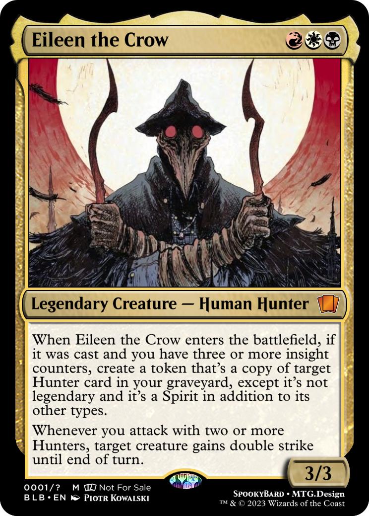 When Eileen the Crow enters the battlefield, if it was cast and you have three or more insight counters, create a token that’s a copy of target Hunter card in your graveyard, except it’s not legendary and it’s a Spirit in addition to its other types.