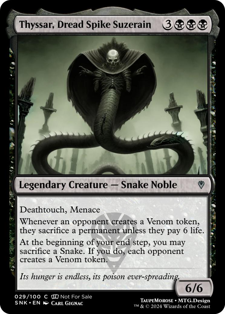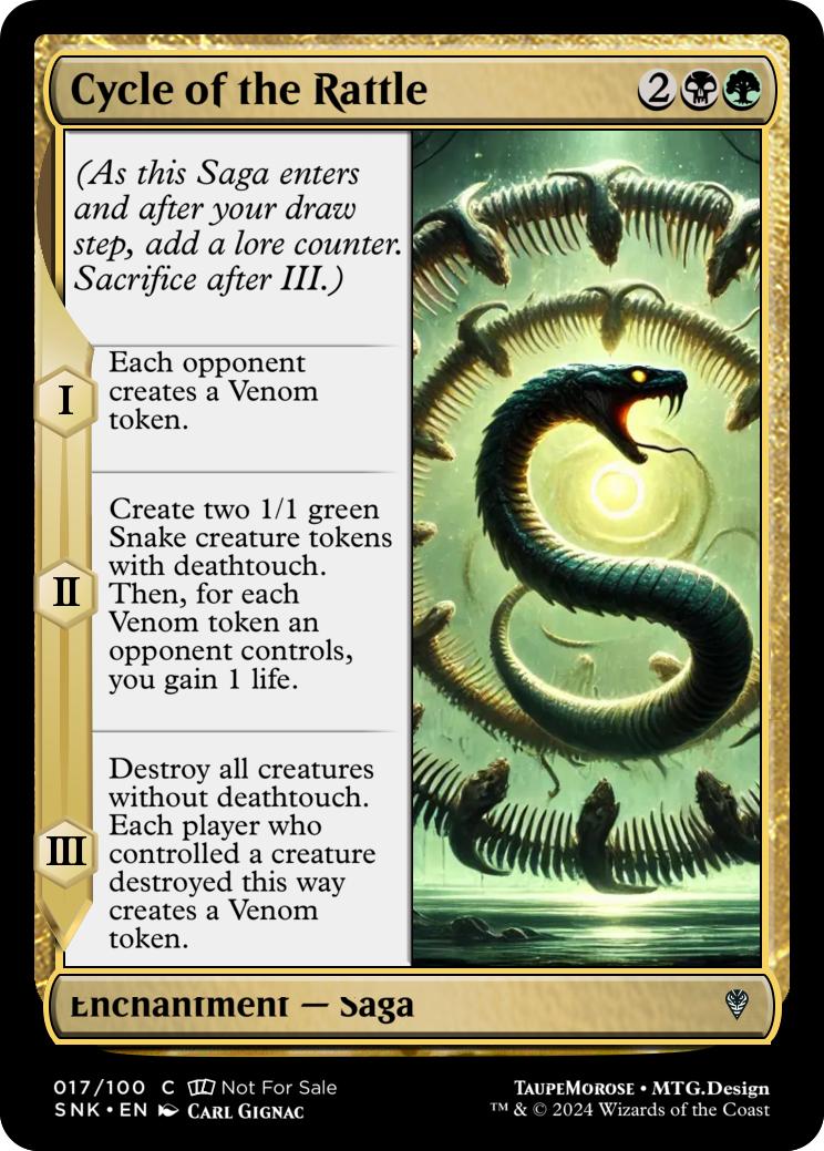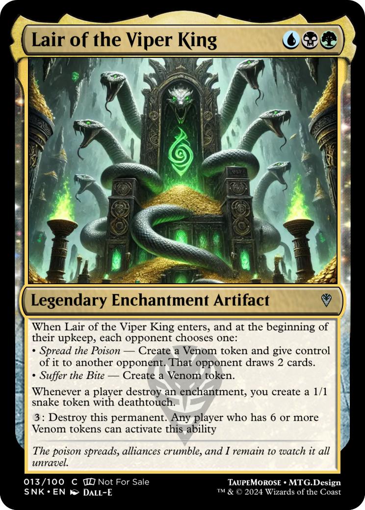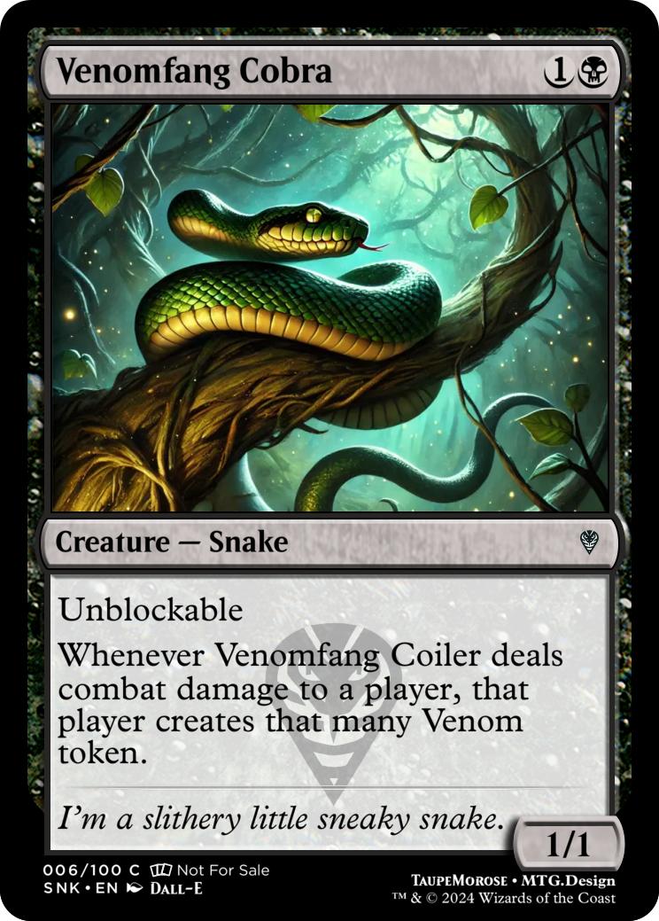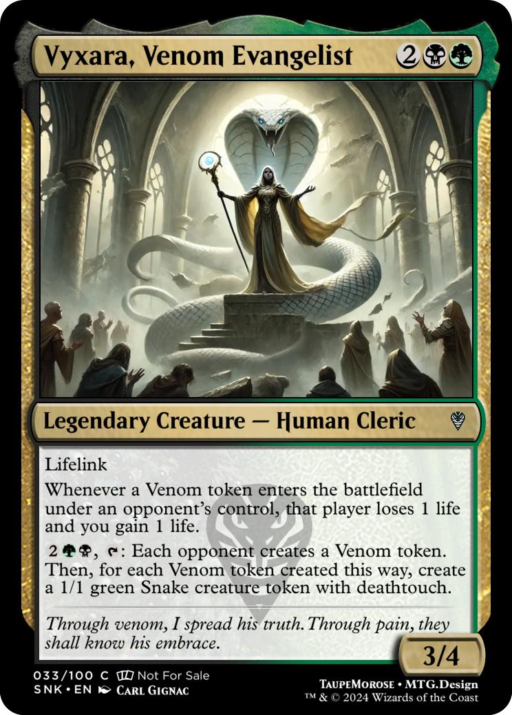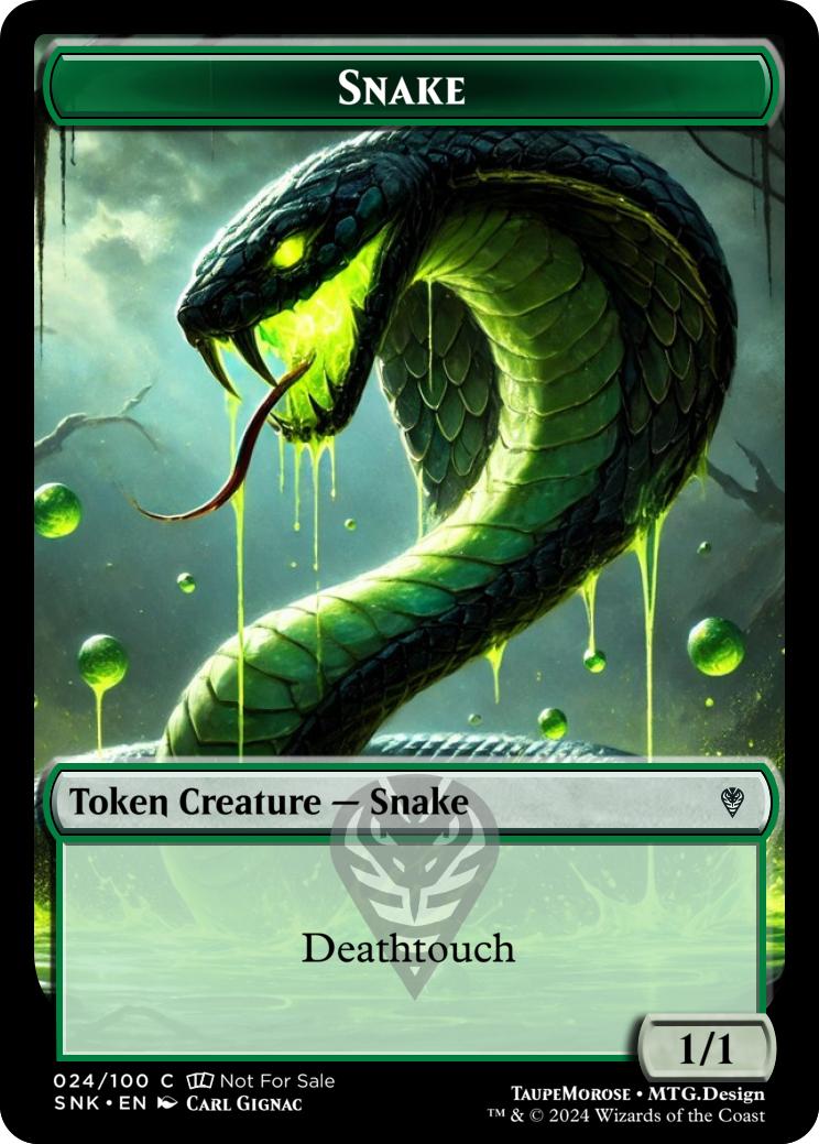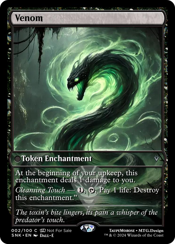 Whenever a Snake you control deals combat damage to a player, that player creates a Venom token. (It's an enchantment with "At the beginning of your upkeep, this enchantment deals 1 damage to you. {1}, {T}, Pay 1 life: Destroy this enchantment.")