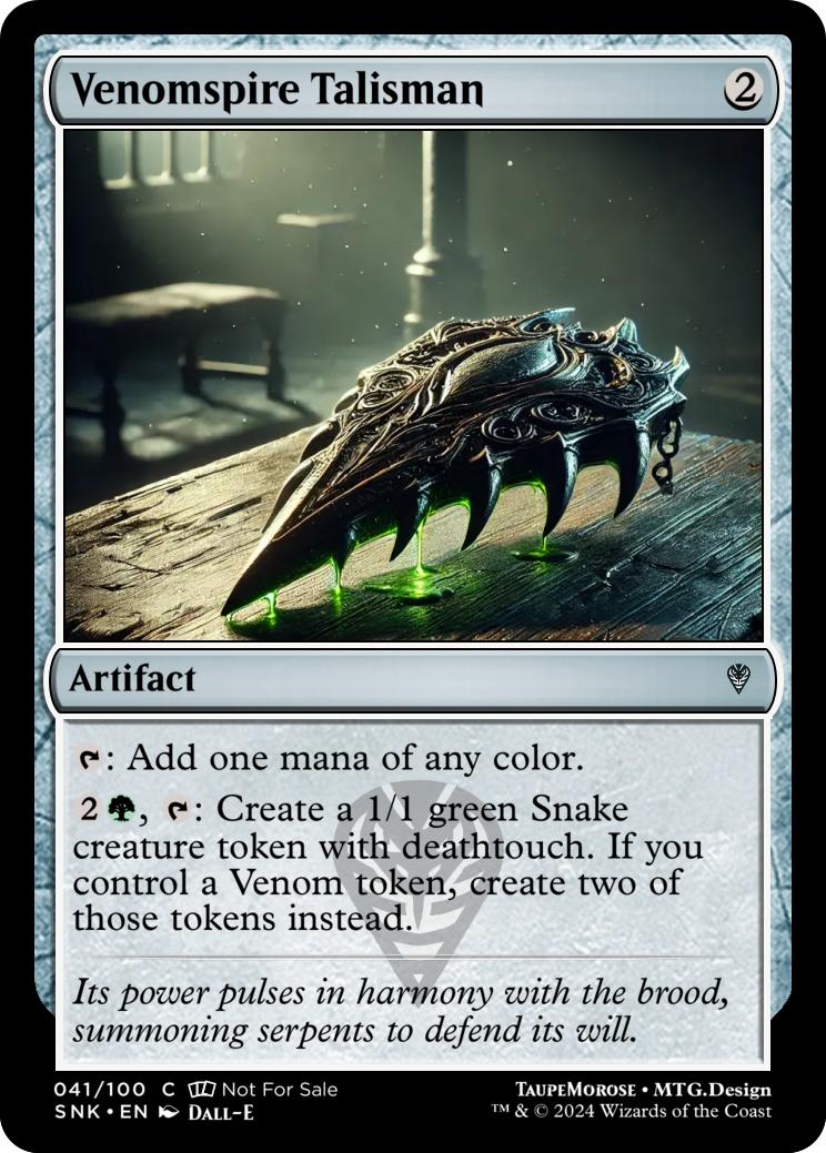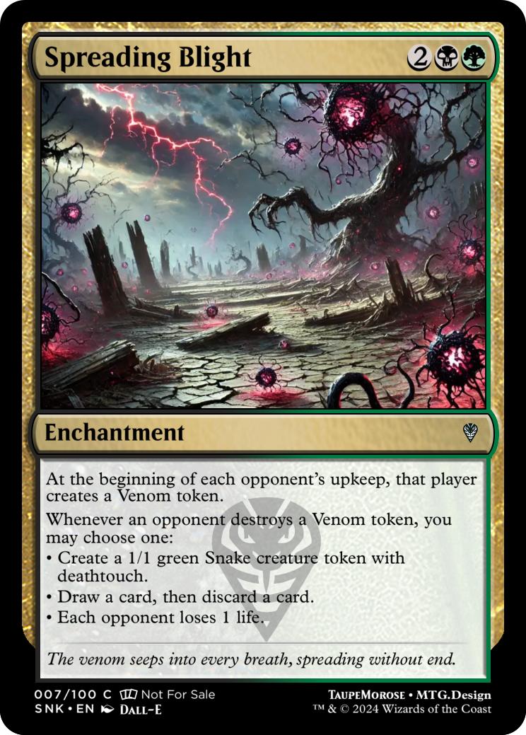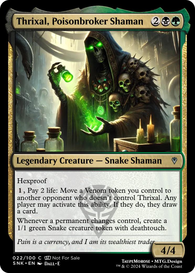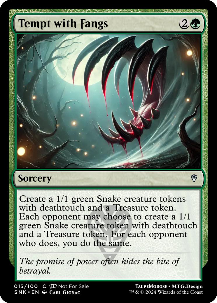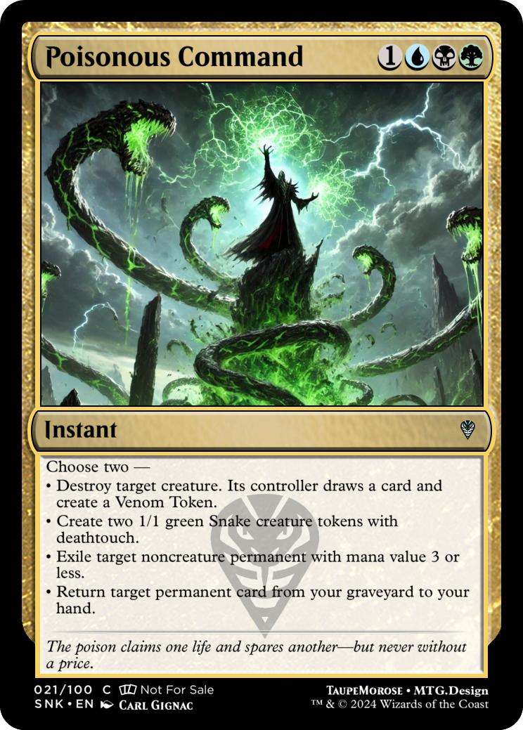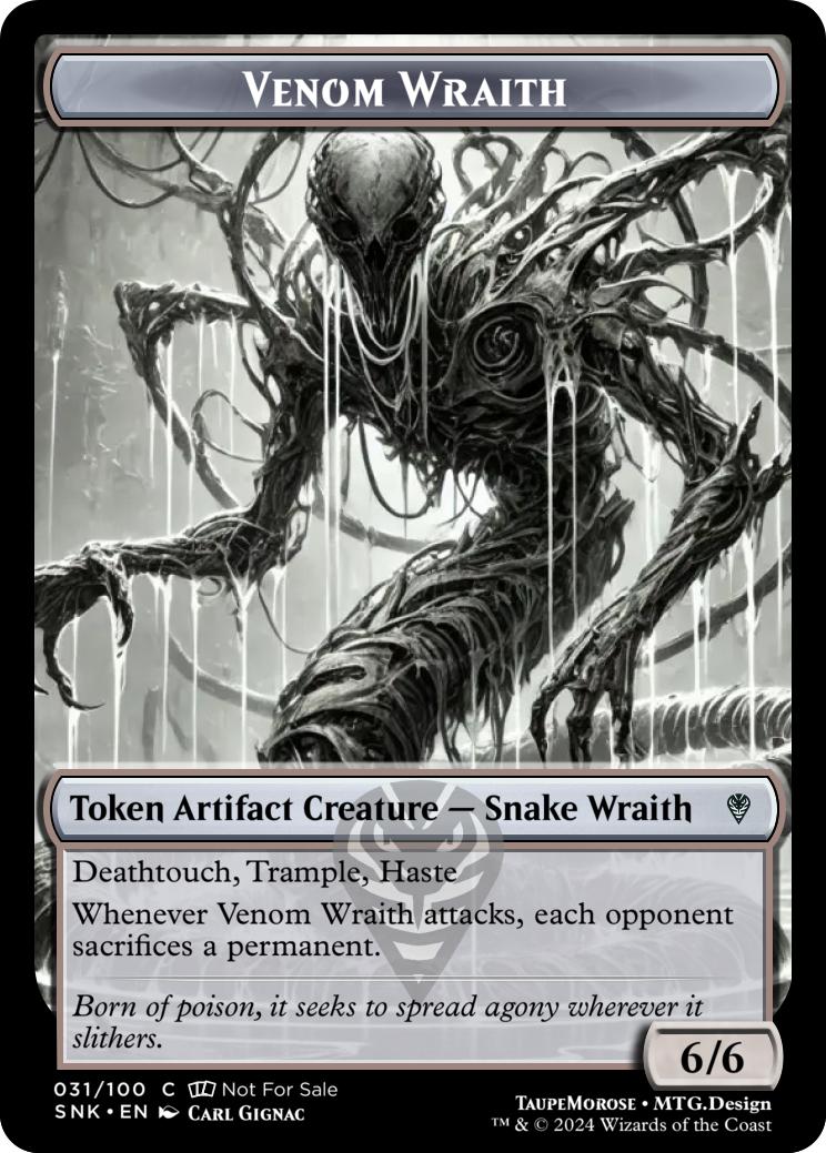 Whenever a Snake you control deals combat damage to a player, that player creates a Venom token. (It's an enchantment with "At the beginning of your upkeep, this enchantment deals 1 damage to you. {1}, {T}, Pay 1 life: Destroy this enchantment.")