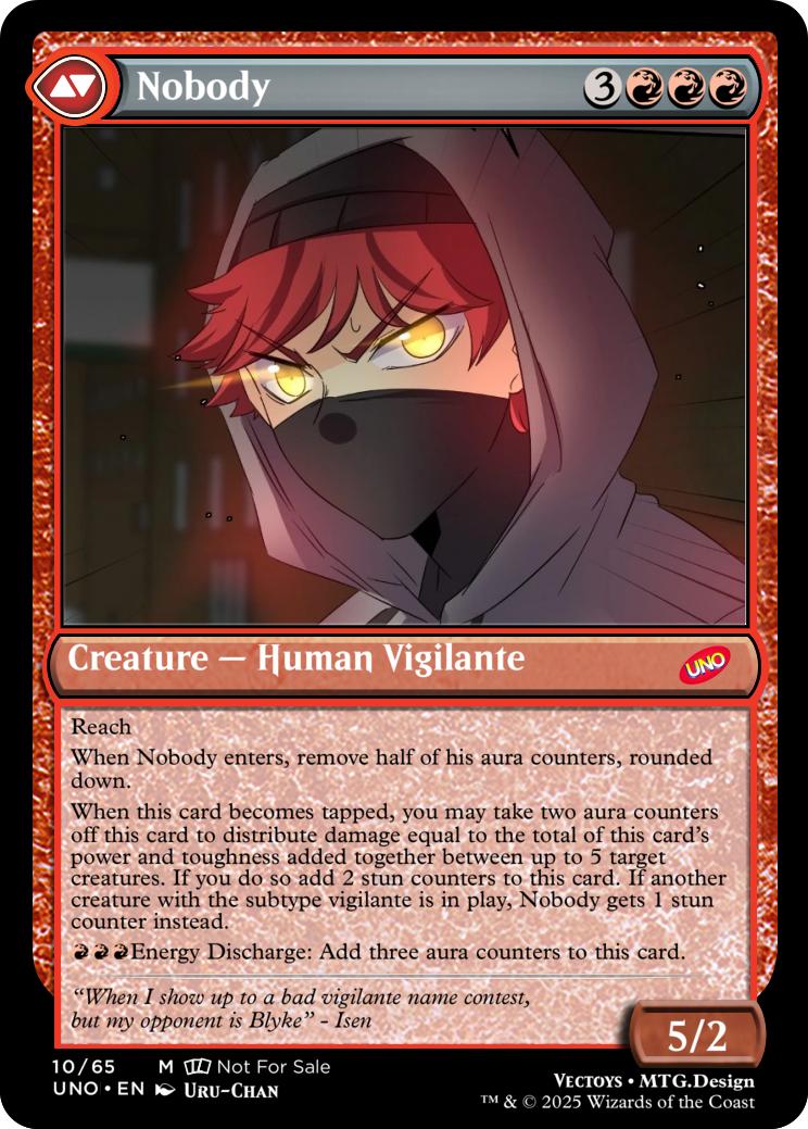When this card becomes tapped, you may take two aura counters off this card to distribute damage equal to the total of this card’s power and toughness added together between up to 5 target creatures. If you do so add 2 stun counters to this card. If another creature with the subtype vigilante is in play, Nobody gets 1 stun counter instead.