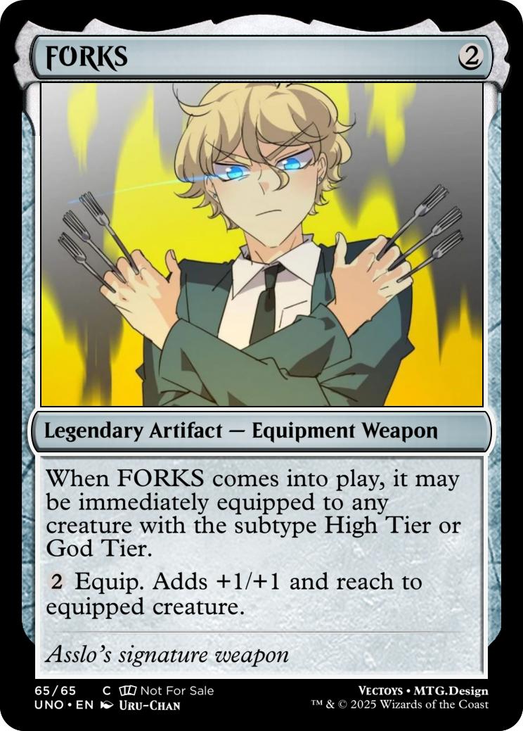 When FORKS comes into play, it may be immediately equipped to any creature with the subtype High Tier or God Tier.