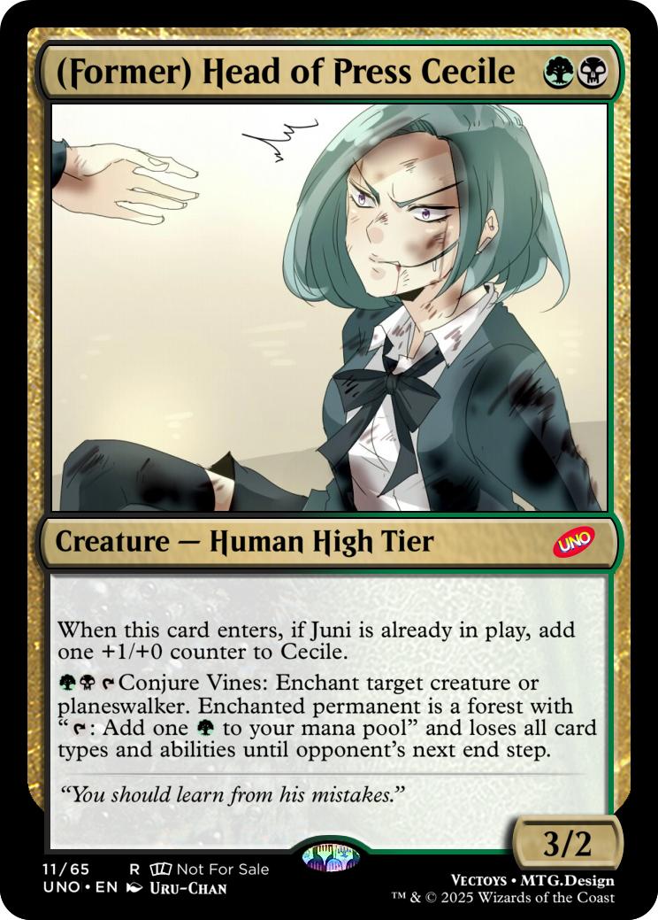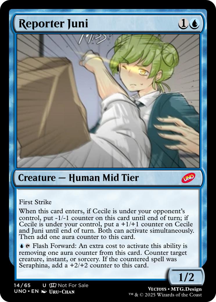 When this card enters, if Cecile is under your opponent's control, put -1/-1 counter on this card until end of turn; if Cecile is under your control, put a +1/+1 counter on Cecile and Juni until end of turn. Both can activate simultaneously. Then add one aura counter to this card.
