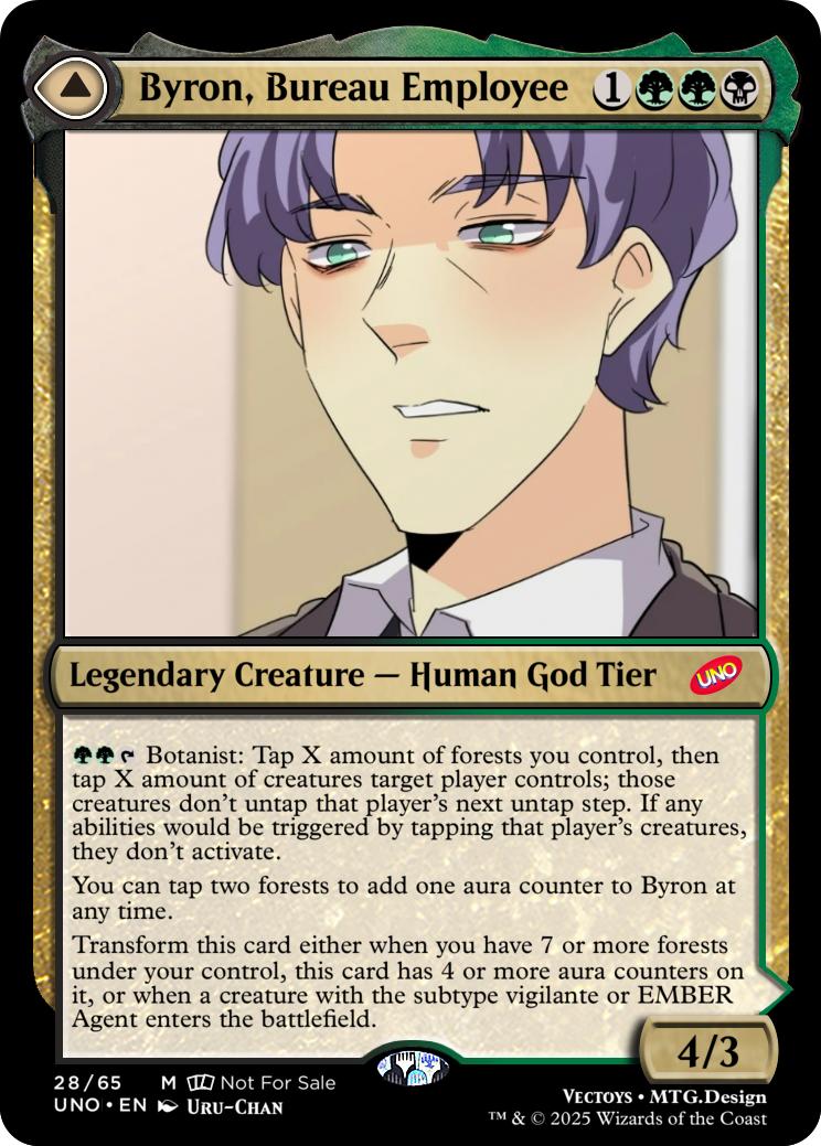 {G}{B}{T}Conjure Vines: Enchant target creature or planeswalker. Enchanted permanent is a forest with "{T}: Add one {G} to your mana pool" and loses all card types and abilities until opponent's next end step.