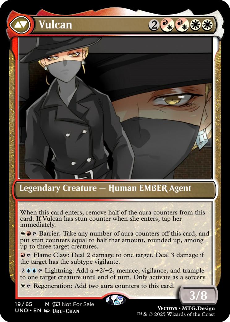 When this card enters, remove half of the aura counters from this card. If Vulcan has stun counter when she enters, tap her immediately.