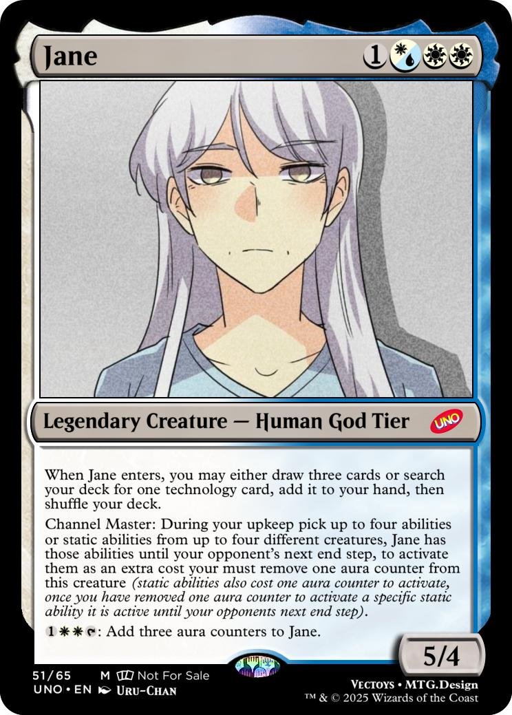 Channel Master: During your upkeep pick up to four abilities or static abilities from up to four different creatures, Jane has those abilities until your opponent's next end step, to activate them as an extra cost your must remove one aura counter from this creature (static abilities also cost one aura counter to activate, once you have removed one aura counter to activate a specific static ability it is active until your opponents next end step).