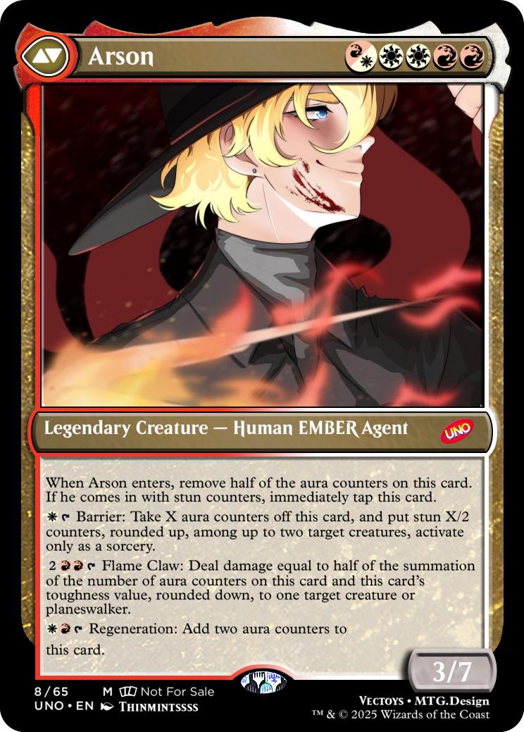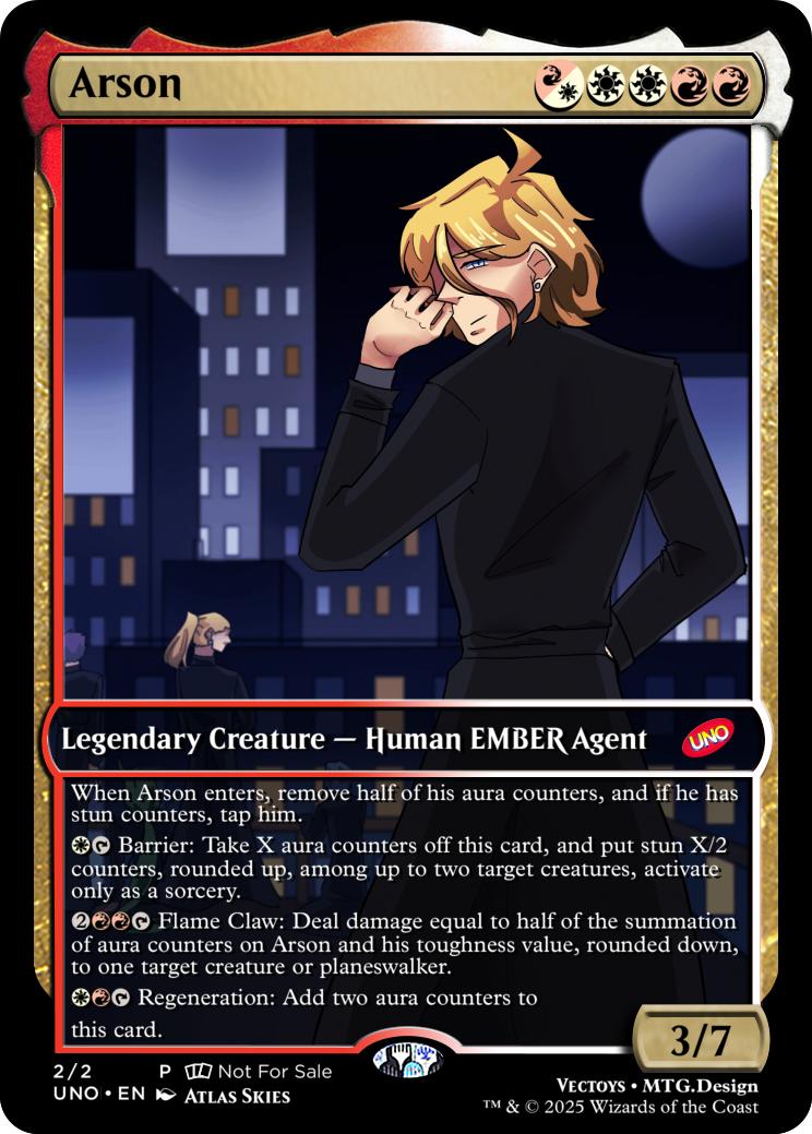 When Arson enters, remove half of the aura counters on this card. If he comes in with stun counters, immediately tap this card.