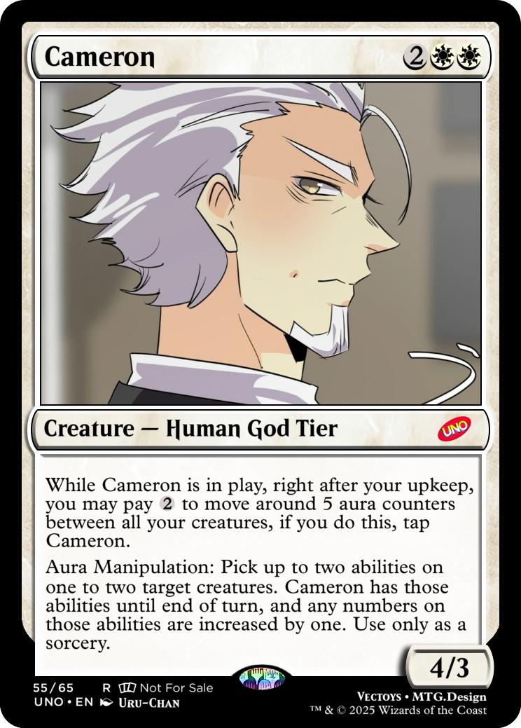 Aura Manipulation: Pick up to two abilities on one to two target creatures. Cameron has those abilities until end of turn, and any numbers on those abilities are increased by one. Use only as a sorcery.