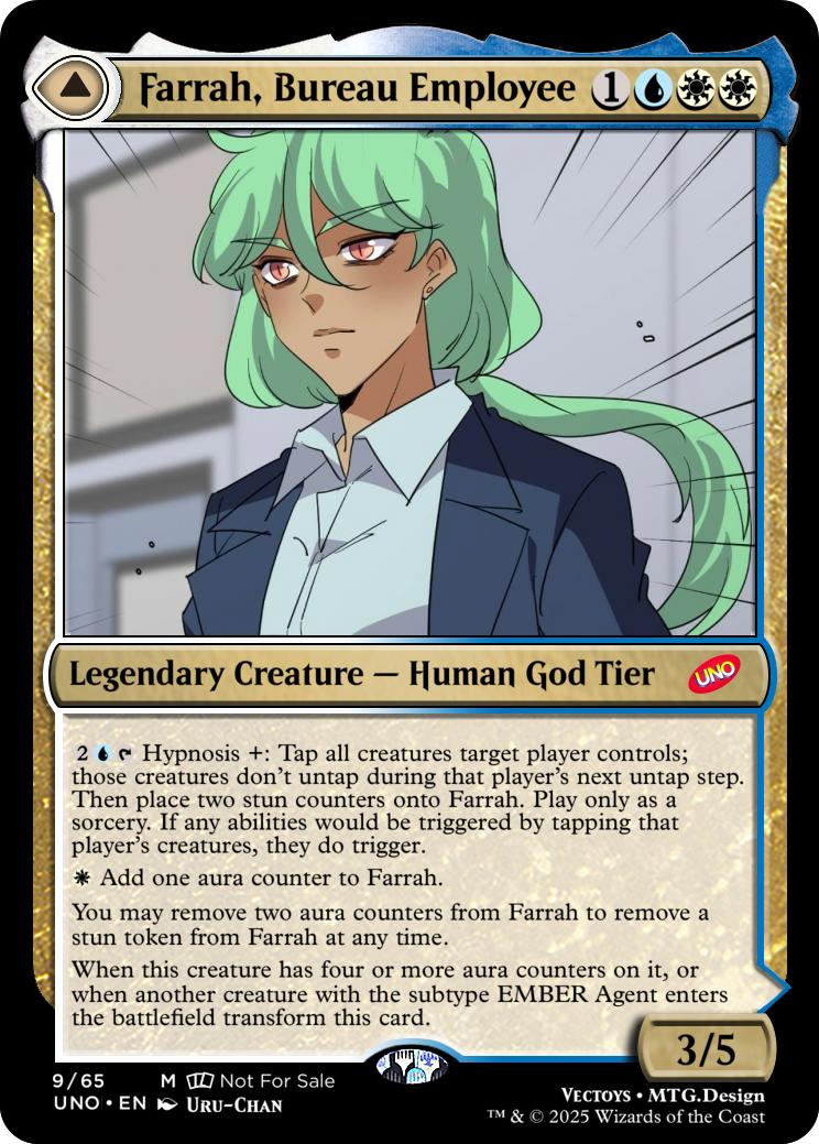 1{U}{T} Hypnosis +: Tap all creatures target player controls; those creatures don't untap during that player's next untap step. Then place one stun counter onto Farrah. If any abilities would be triggered by tapping that player's creatures, they don't trigger.