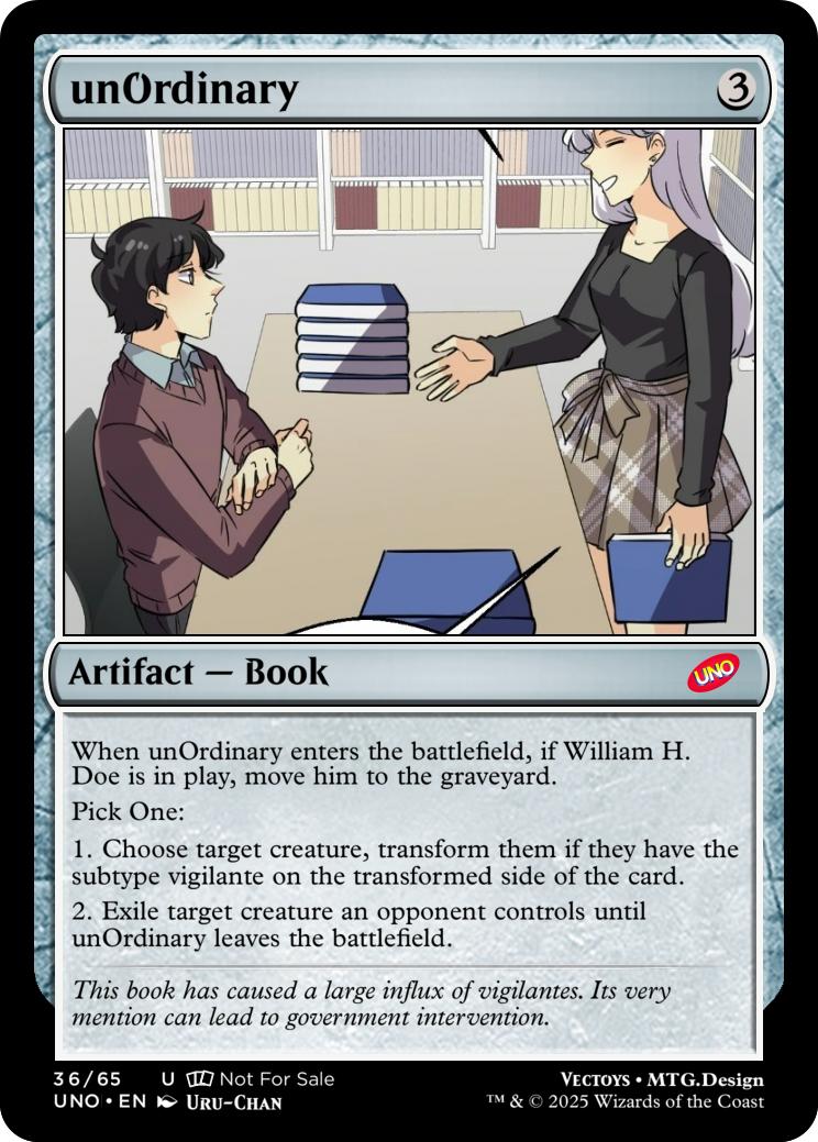 When this card enters, you may look through your deck and add the card unOrdinary to your hand. If you do so, sacrifice a permanent.
