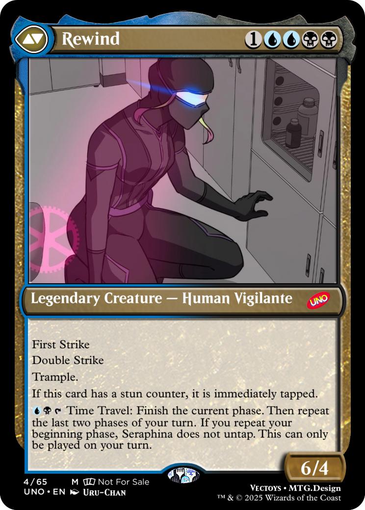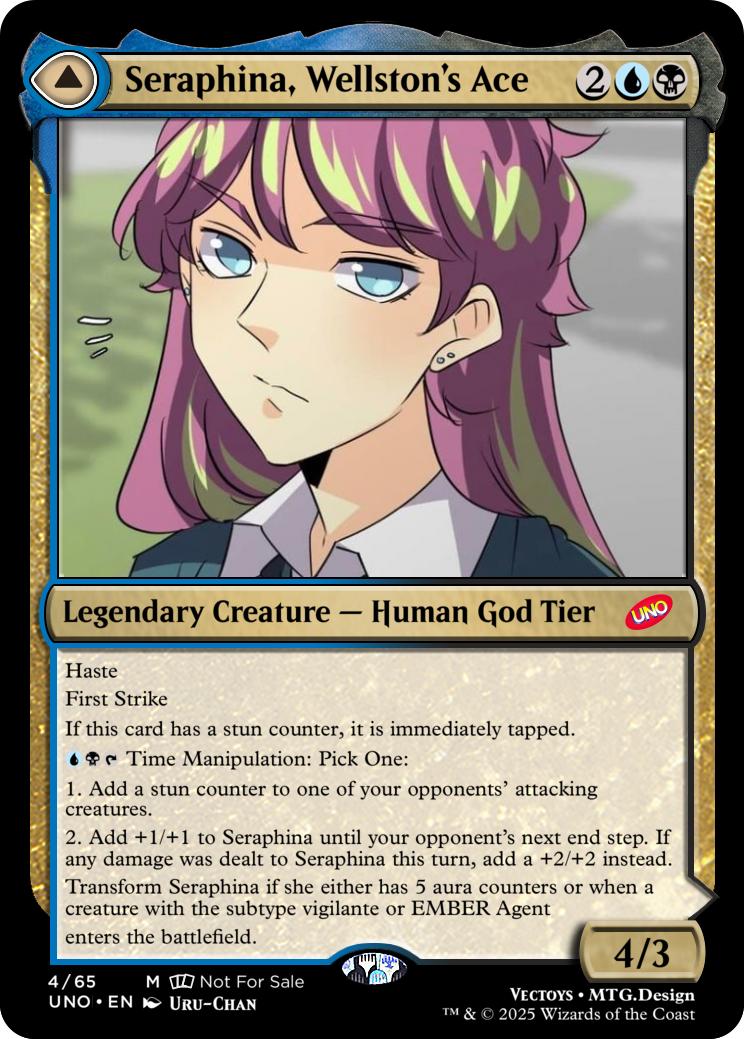 {U}{T} Flash Forward: An extra cost to activate this ability is removing one aura counter from this card. Counter target creature, instant, or sorcery. If the countered spell was Seraphina, add a +2/+2 counter to this card.