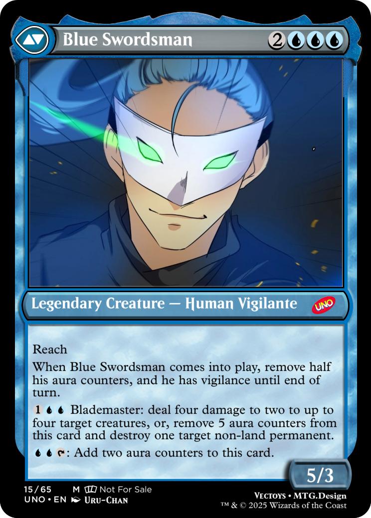 When Blue Swordsman comes into play, remove half his aura counters, and he has vigilance until end of turn.