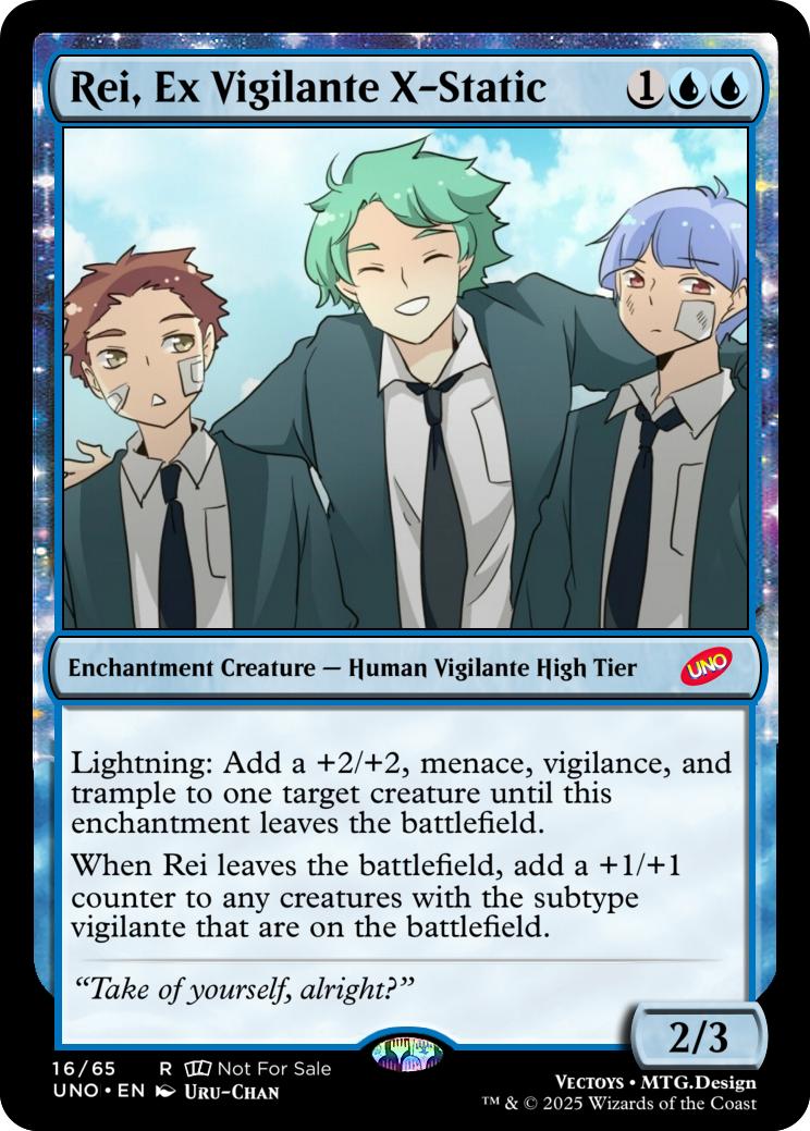When Rei leaves the battlefield, add a +1/+1 counter to any creatures with the subtype vigilante that are on the battlefield.